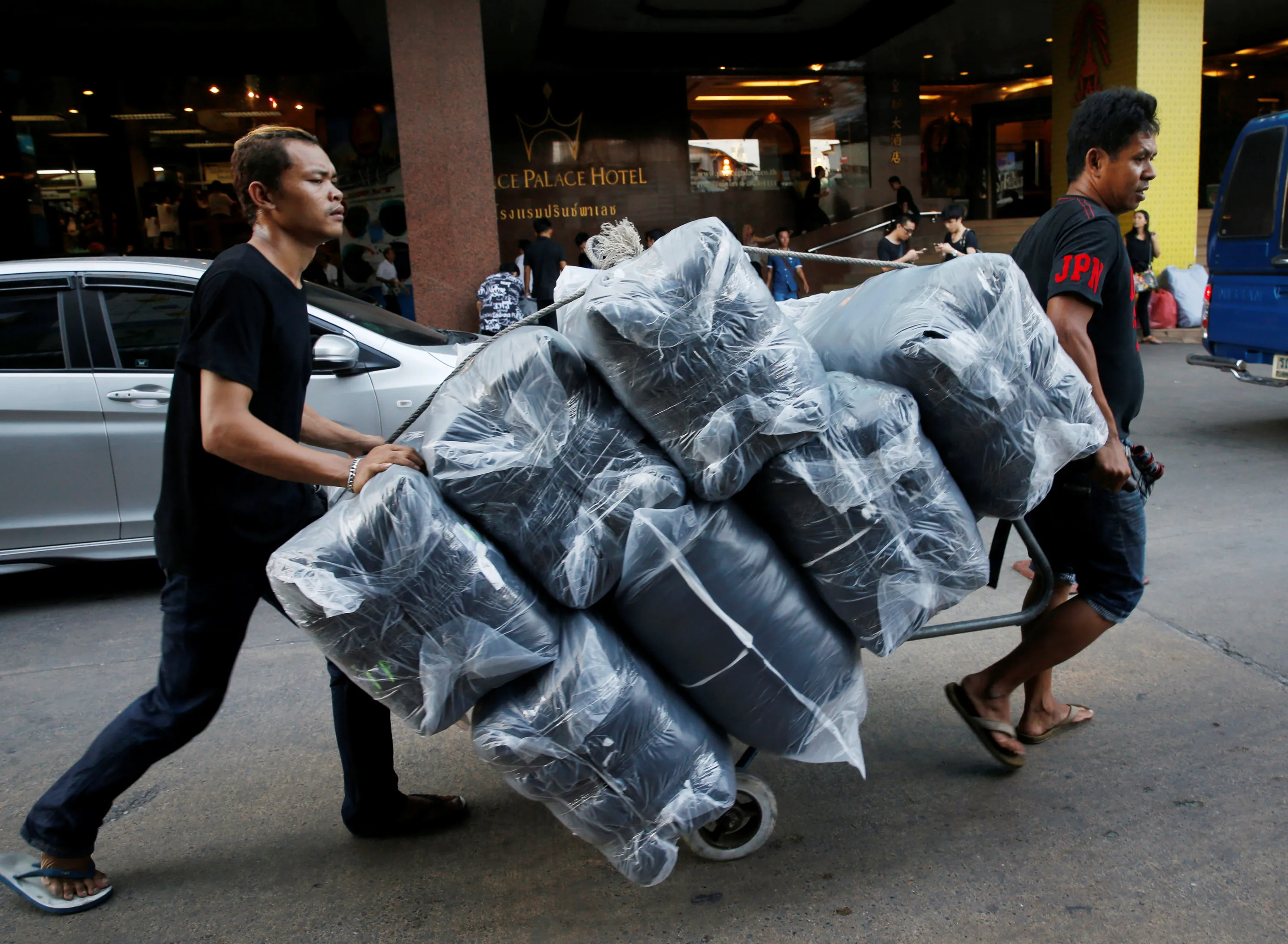 People restock black T-shirts for shoppers mourning the passing of Thai King Bhumibol Adulyadej at Bo Bae wholesale market in Bangkok, Thailand October 15, 2016. (Photo by Edgar Su/Reuters)
