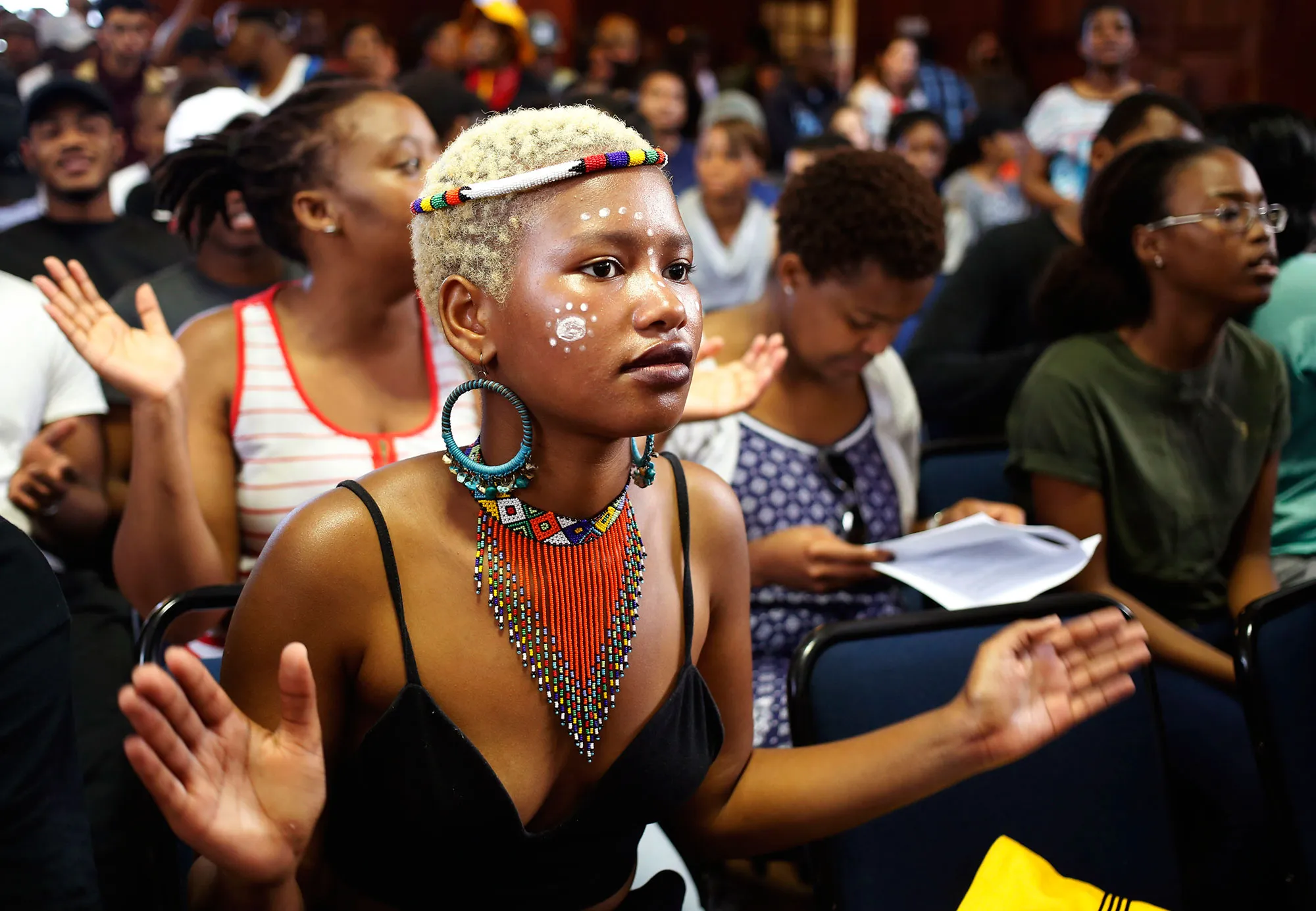 A student from the University of Cape Town claps her hands as she and other students chant and sing as they gather to discuss possible student fee increases at there campus in Cape Town, South Africa, Monday, September 19, 2016. (Photo by Schalk van Zuydam/AP Photo)