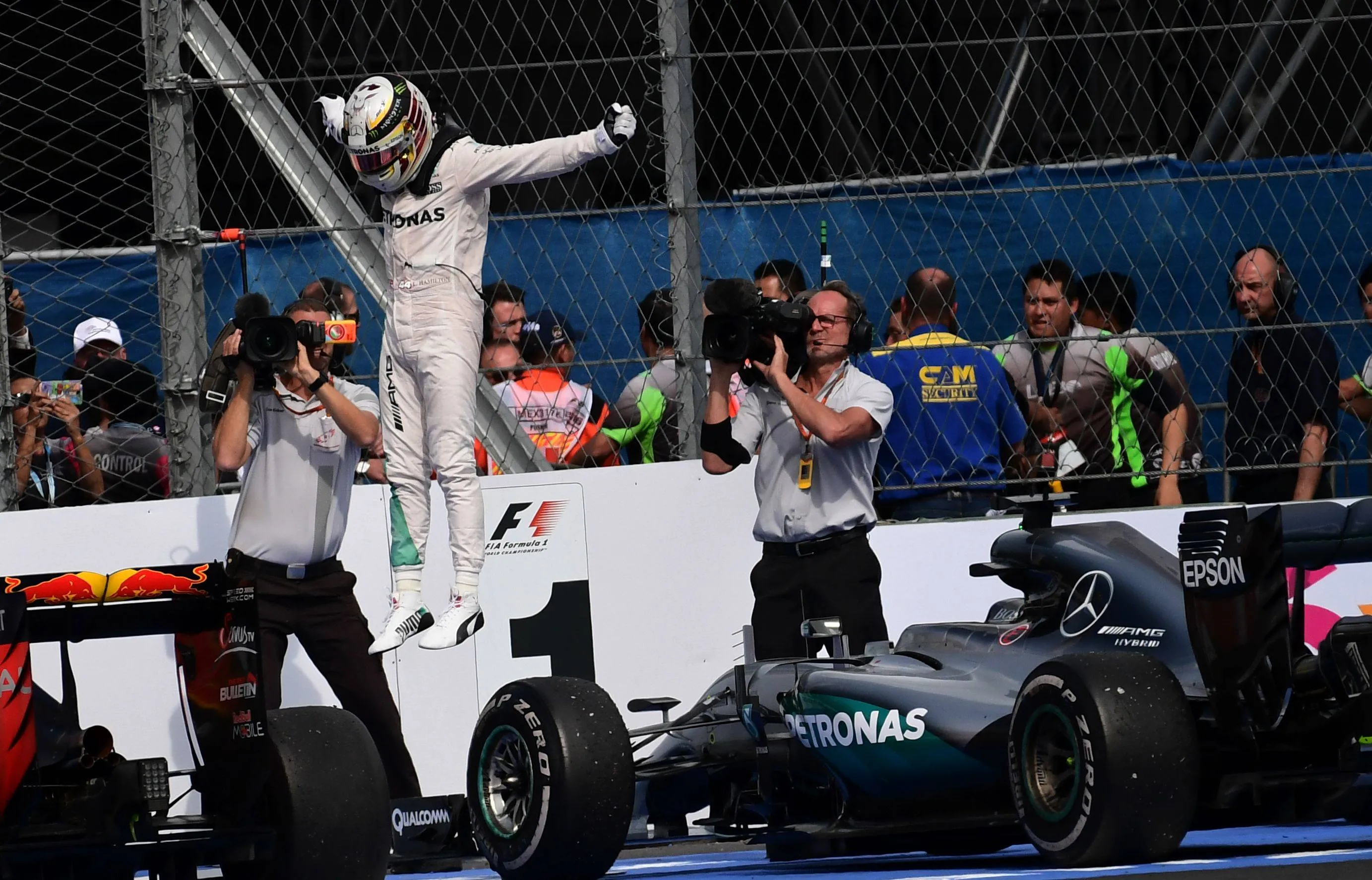 Mercedes AMG Petronas F1 Team British driver Lewis Hamilton celebrates at the end of the Formula One Mexico Grand Prix at the Hermanos Rodriguez circuit in Mexico City on October 30, 2016. Lewis Hamilton kept his world championship hopes alive with victory in the Mexican Grand Prix, Mercedes team-mate Nico Rosberg edged closer to the crown with a second-place finish. Sebastian Vettel, in a Ferrari, was third. (Photo by Pedro Pardo/AFP Photo)
