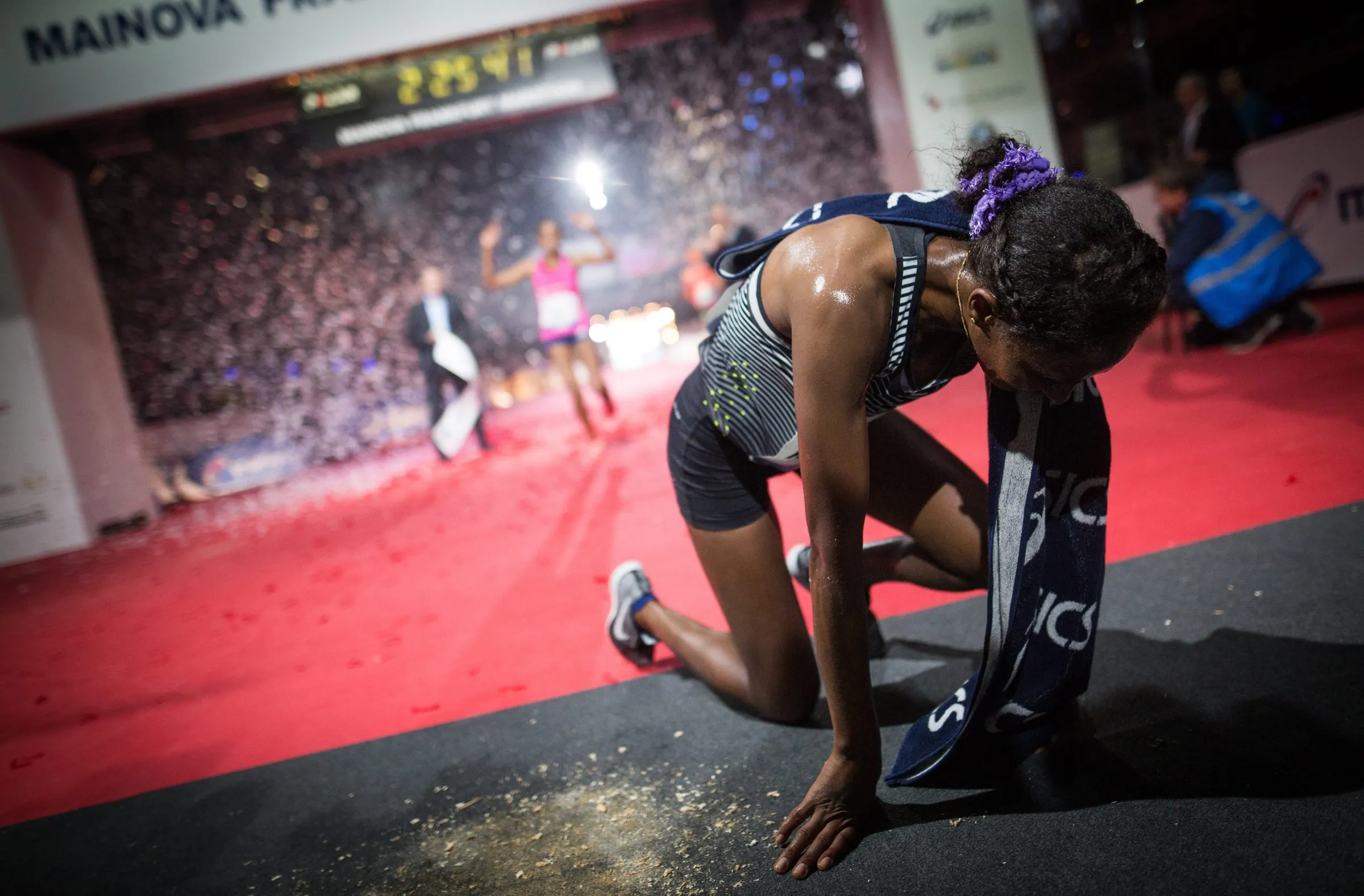 Mamitu Daska Molisa from Ethiopia reacts after winning the women's race of the 2016 Frankfurt Marathon in Frankfurt, Germany, 30 October 2016. (Photo by Christoph Schmidt/EPA)