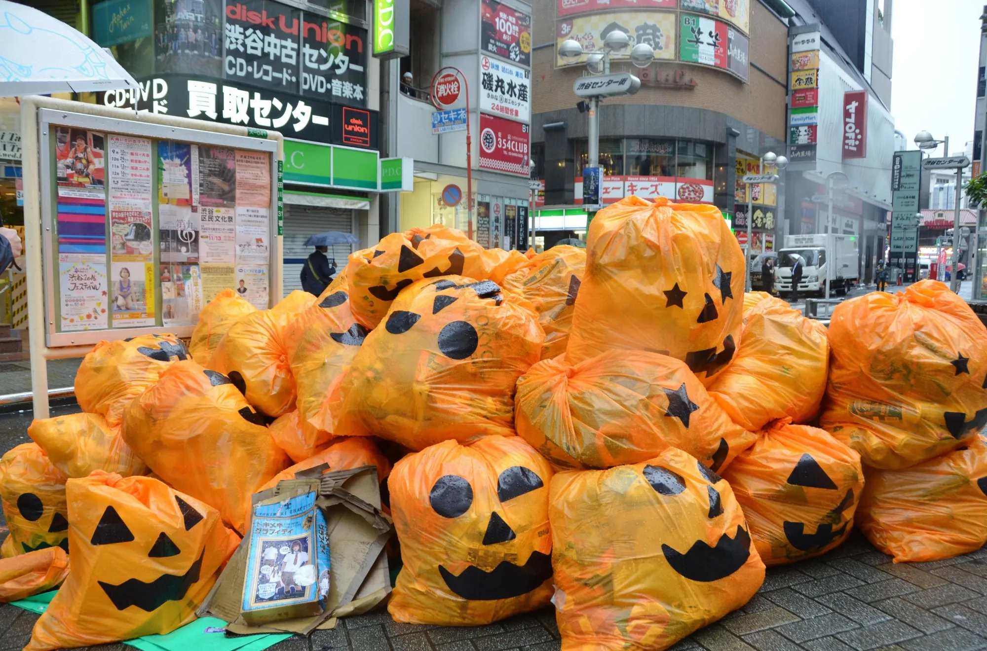 Jack-o'-lantern plastic bags filled with trash left by costumed partygoers are piled up on a sidewalk in Shibuya Ward, Tokyo, Japan early Tuesday, November 1, 2016. (Photo by Kyodo News)