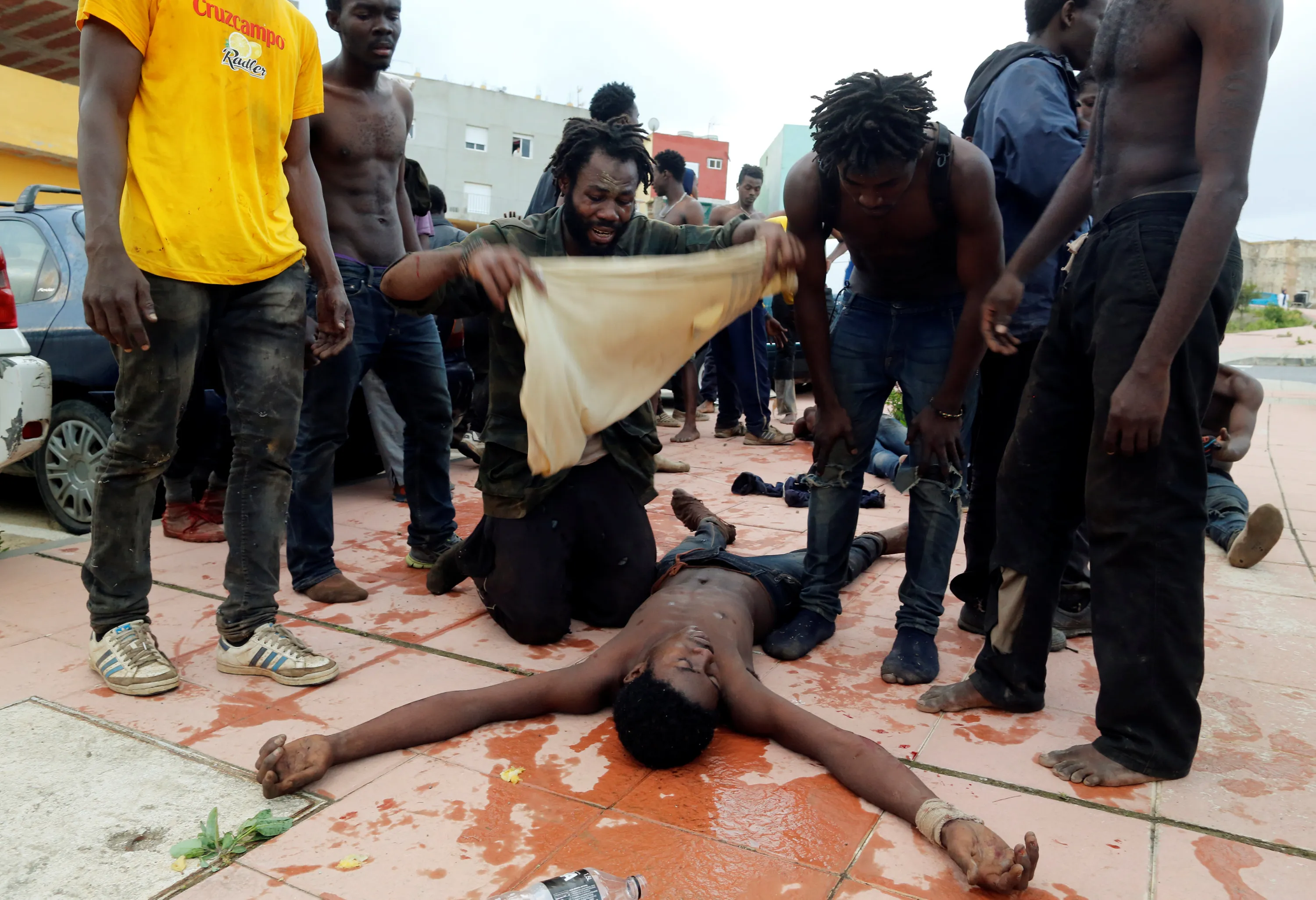 An African migrant gets fanned on the ground after crossing a border fence between Morocco and Spain's north African enclave of Ceuta October 31, 2016. (Photo by M. Martin/Reuters)