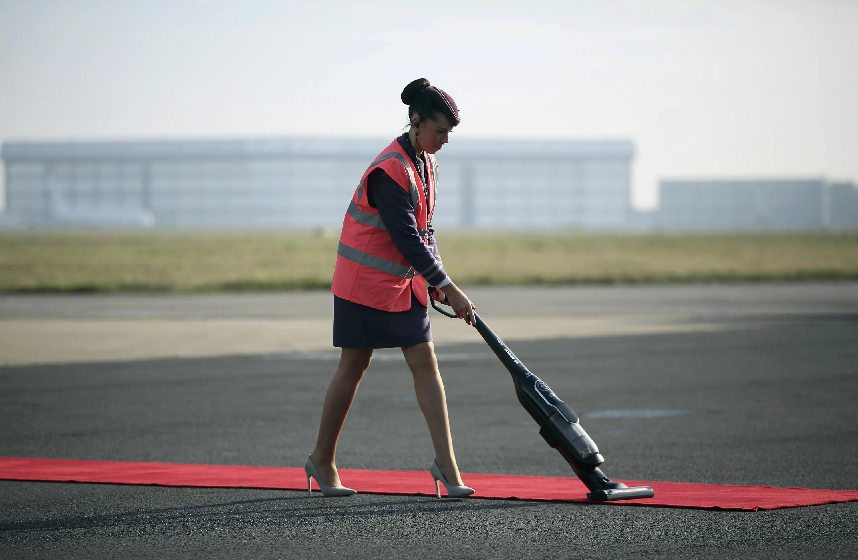 A worker vaccums the red carpet before the arrival of Colombia's President Juan Manuel Santos and his wife Maria Clemencia de Santos at Stansted airport in Stansted, Britain October 31, 2016. (Photo by Neil Hall/Reuters)