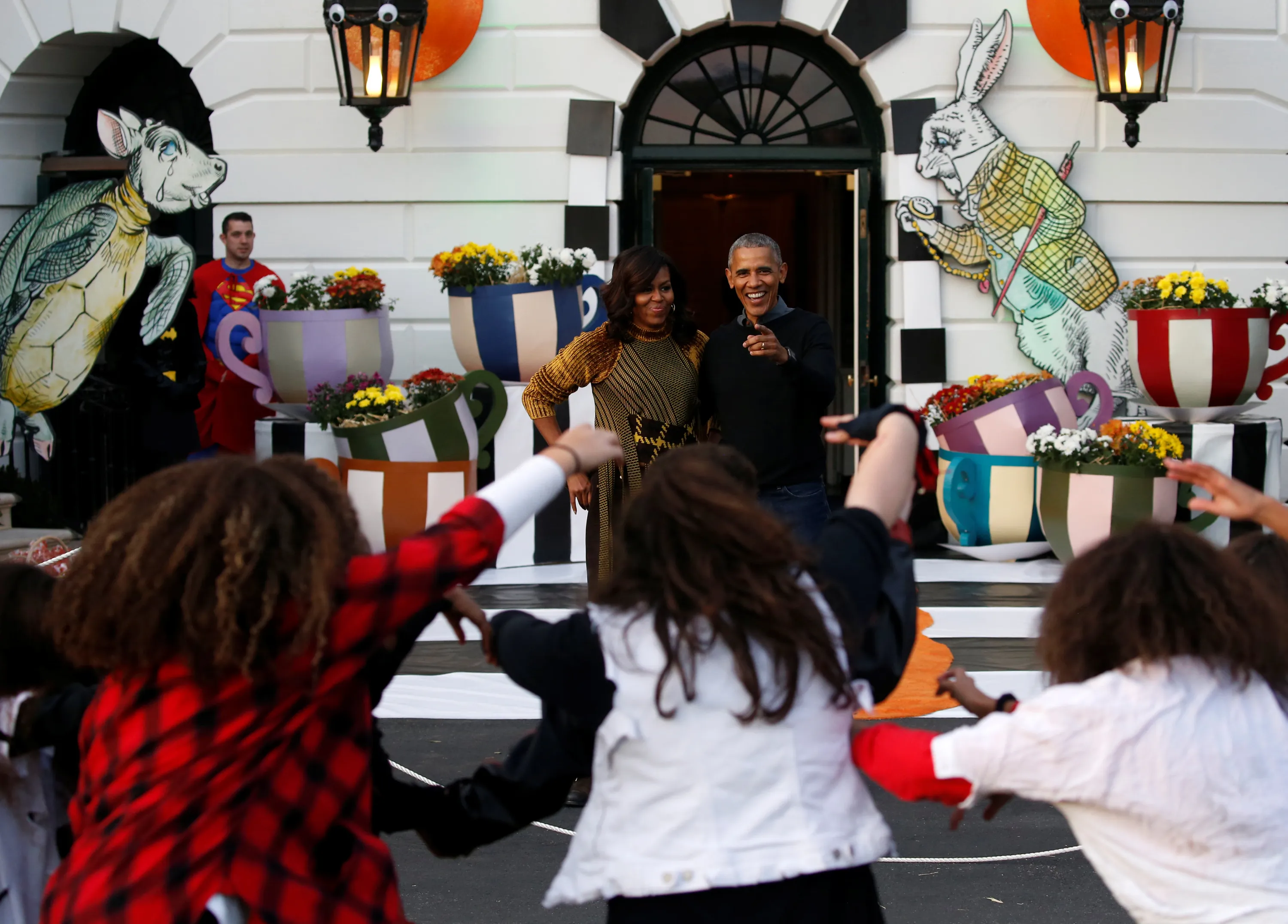 U.S. President Barack Obama and first lady Michelle Obama react to a flash mob of dancers portraying the zombies from Michael Jackson's Thriller video, after they finishing giving out Halloween treats to children from the South Portico of the White House in Washington, U.S. October 31, 2016. (Photo by Jonathan Ernst/Reuters)