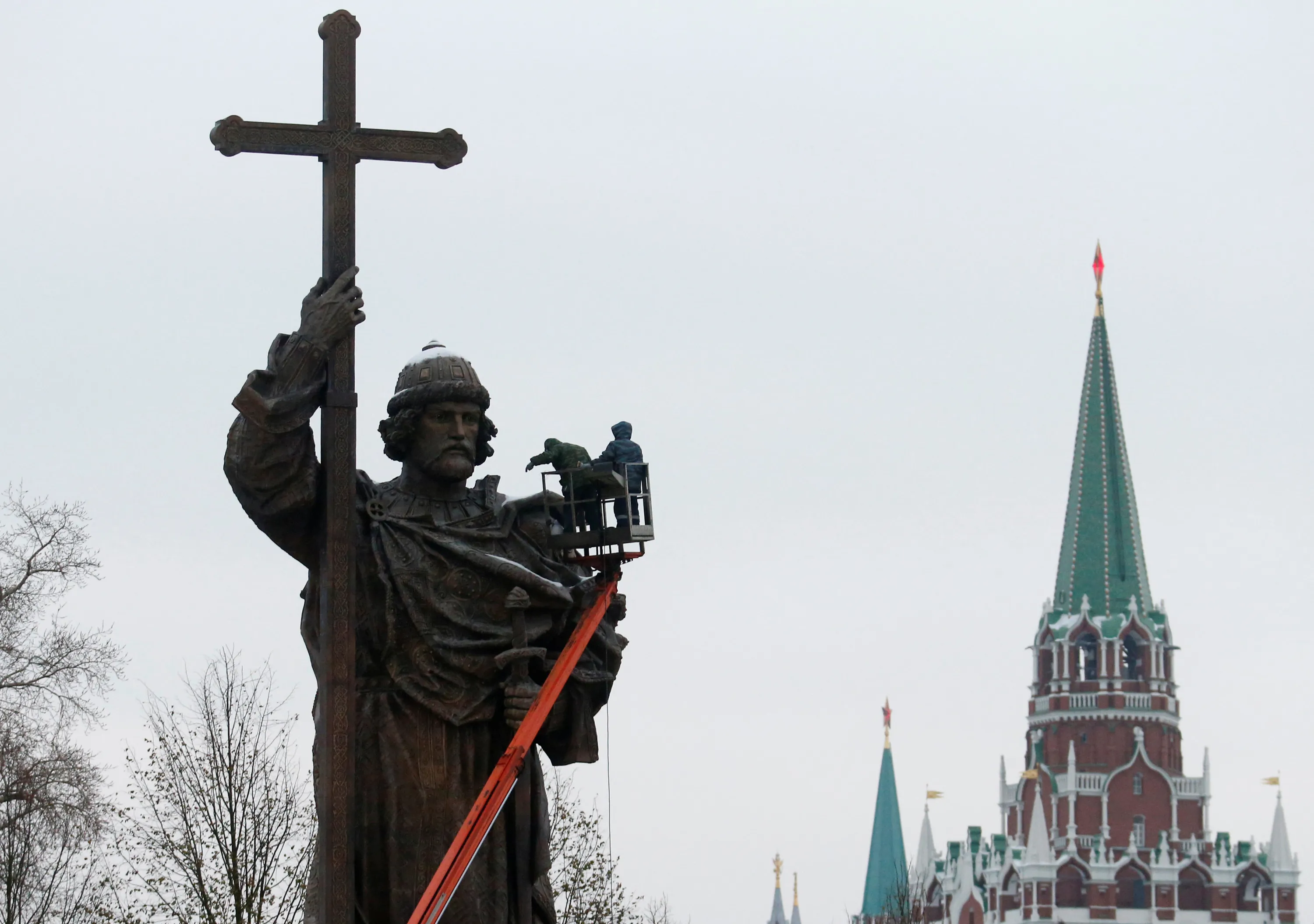 Employees work on the newly erected monument of grand prince Vladimir I, who initiated the christianization of Kievan Rus' in 988AD, with towers of the Kremlin seen in the background, in central Moscow, Russia, November 2, 2016. (Photo by Maxim Zmeyev/Reuters)