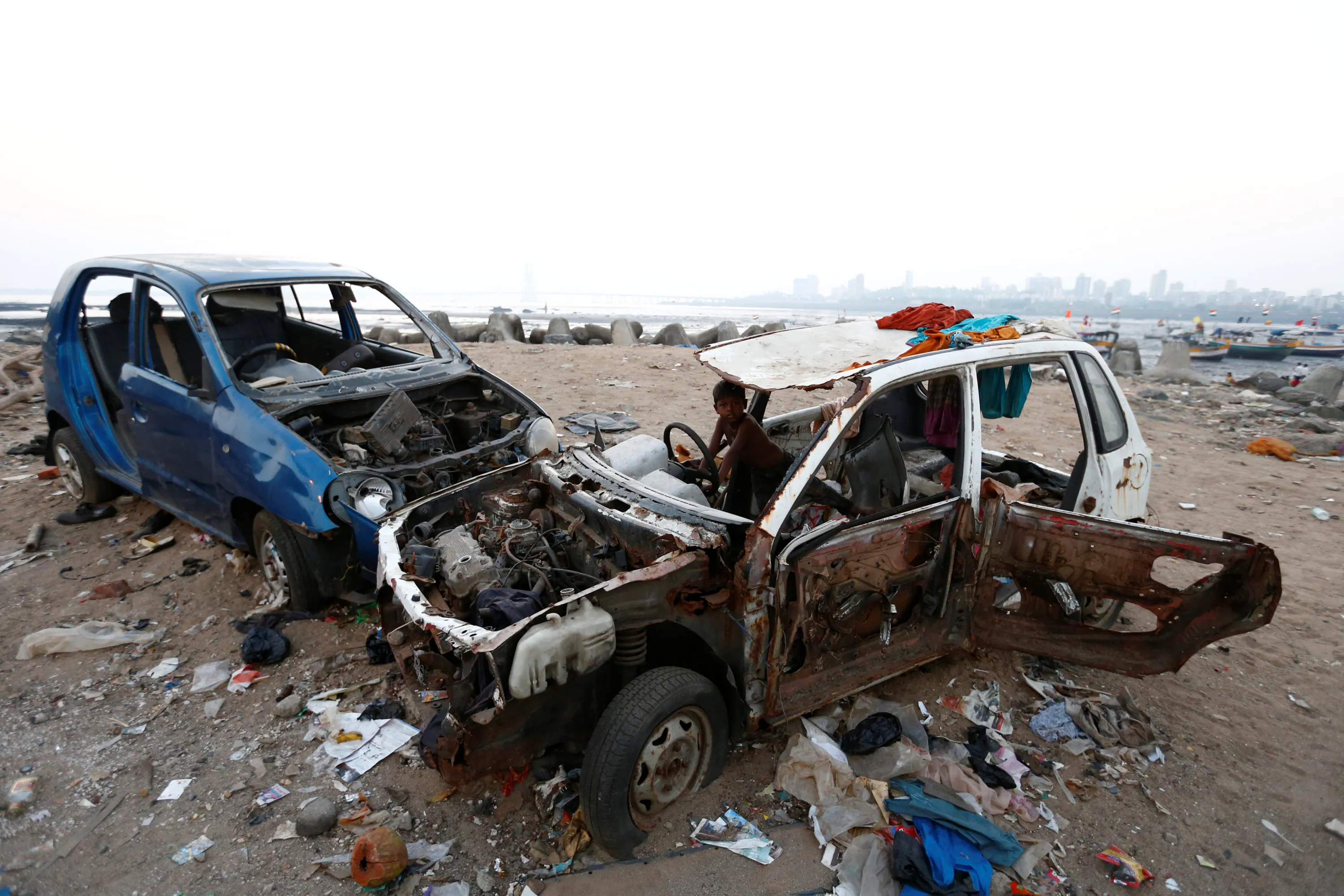 A boy plays inside a scrapped car on a beach along the Arabian Sea in Mumbai, India, November 1, 2016. (Photo by Danish Siddiqui/Reuters)