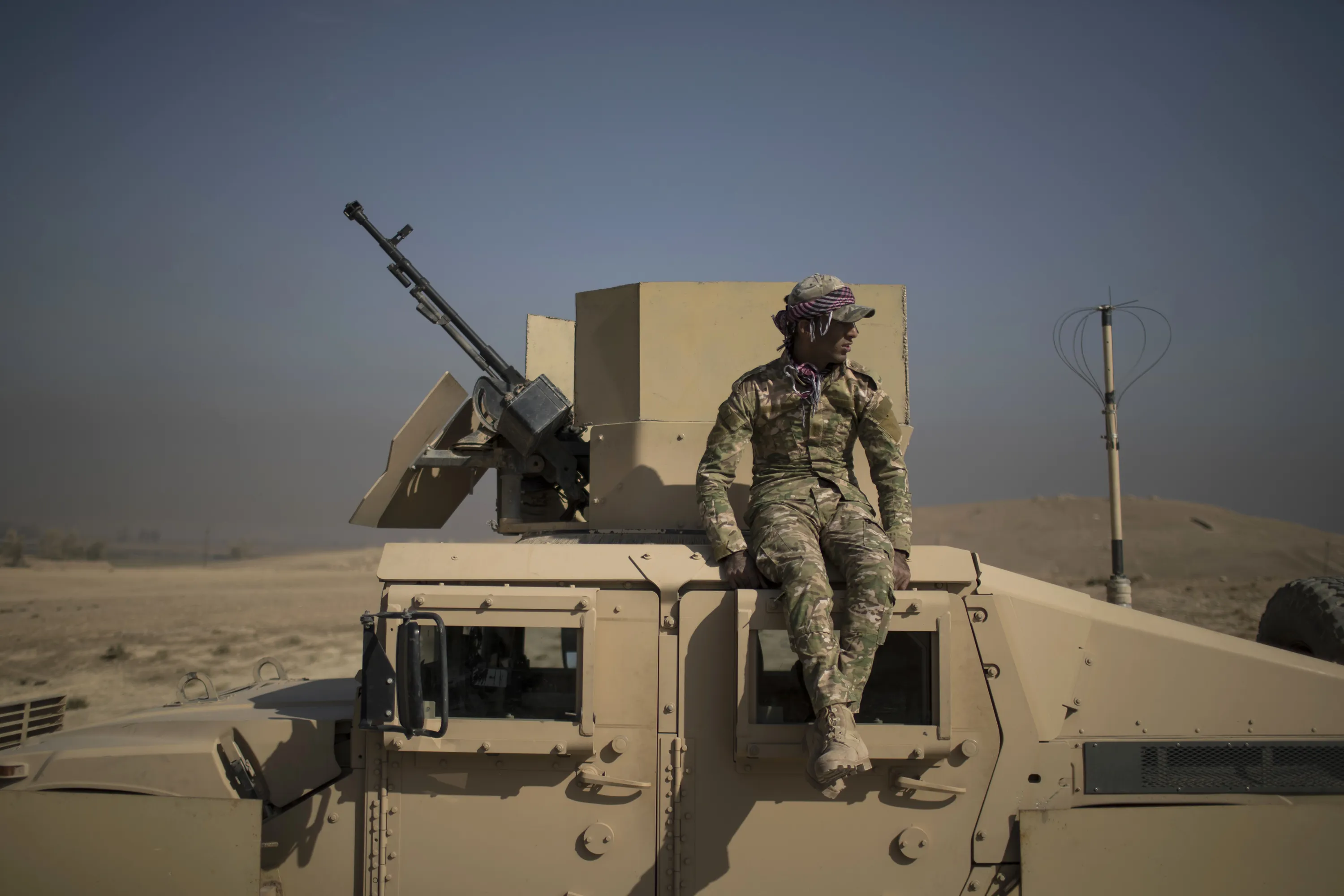 An Iraqi army soldier sits atop an armored vehicle on the outskirts of Hamam al-Alil, south of Mosul, Iraq, Sunday, November 6, 2016. On the southern front, Iraqi forces are still some 12 miles (20 kilometers) from the city center. The fighting is centered on the town of Hamam al-Alil, where Associated Press journalists could hear gunfire and saw attack helicopters firing on IS positions. (Photo by Felipe Dana/AP Photo)