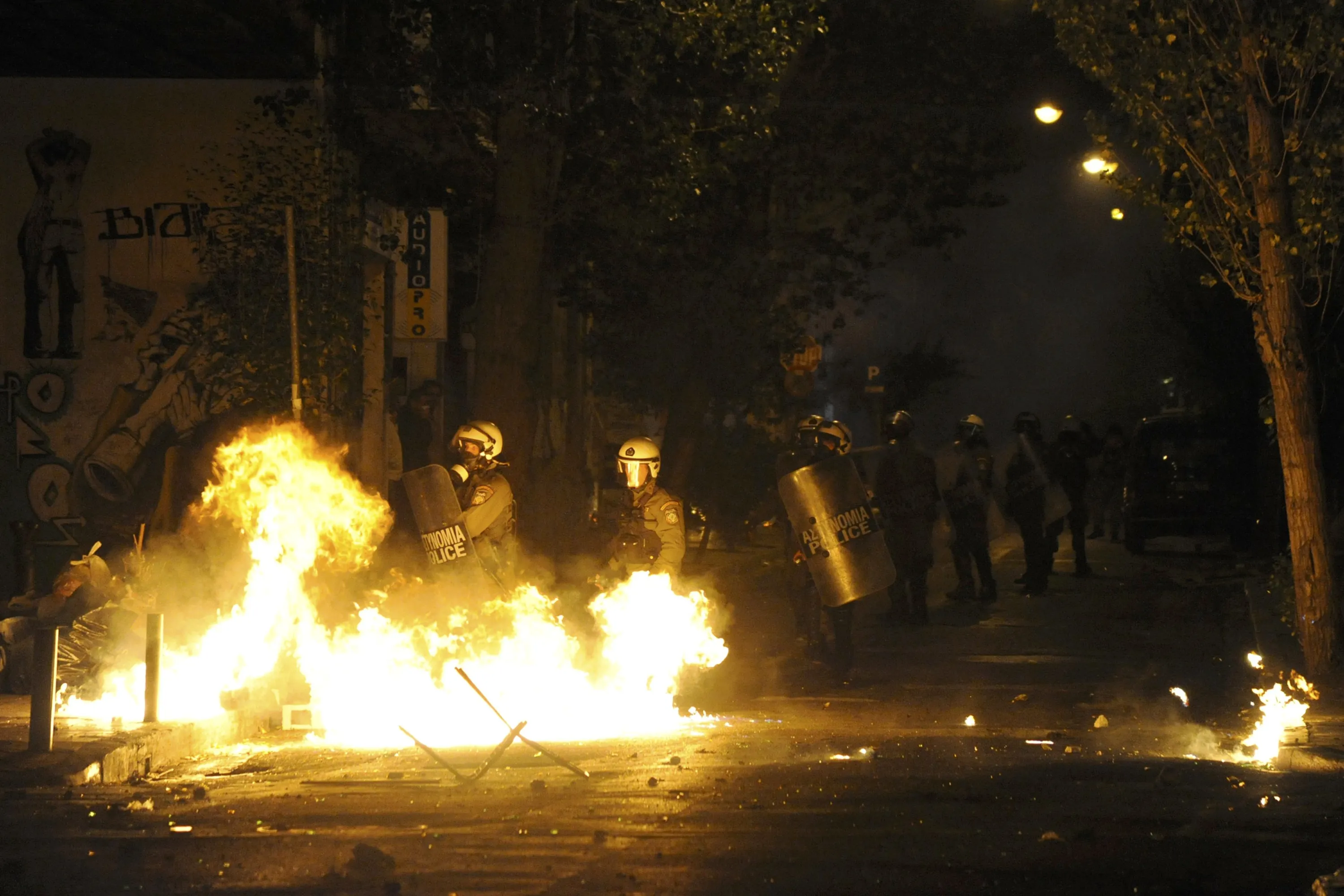 A petrol bomb explodes next to riot police during a demonstration against the visit of U.S President Barack Obama, in Athens, Greece, November 15, 2016. (Photo by Michalis Karagiannis/Reuters)