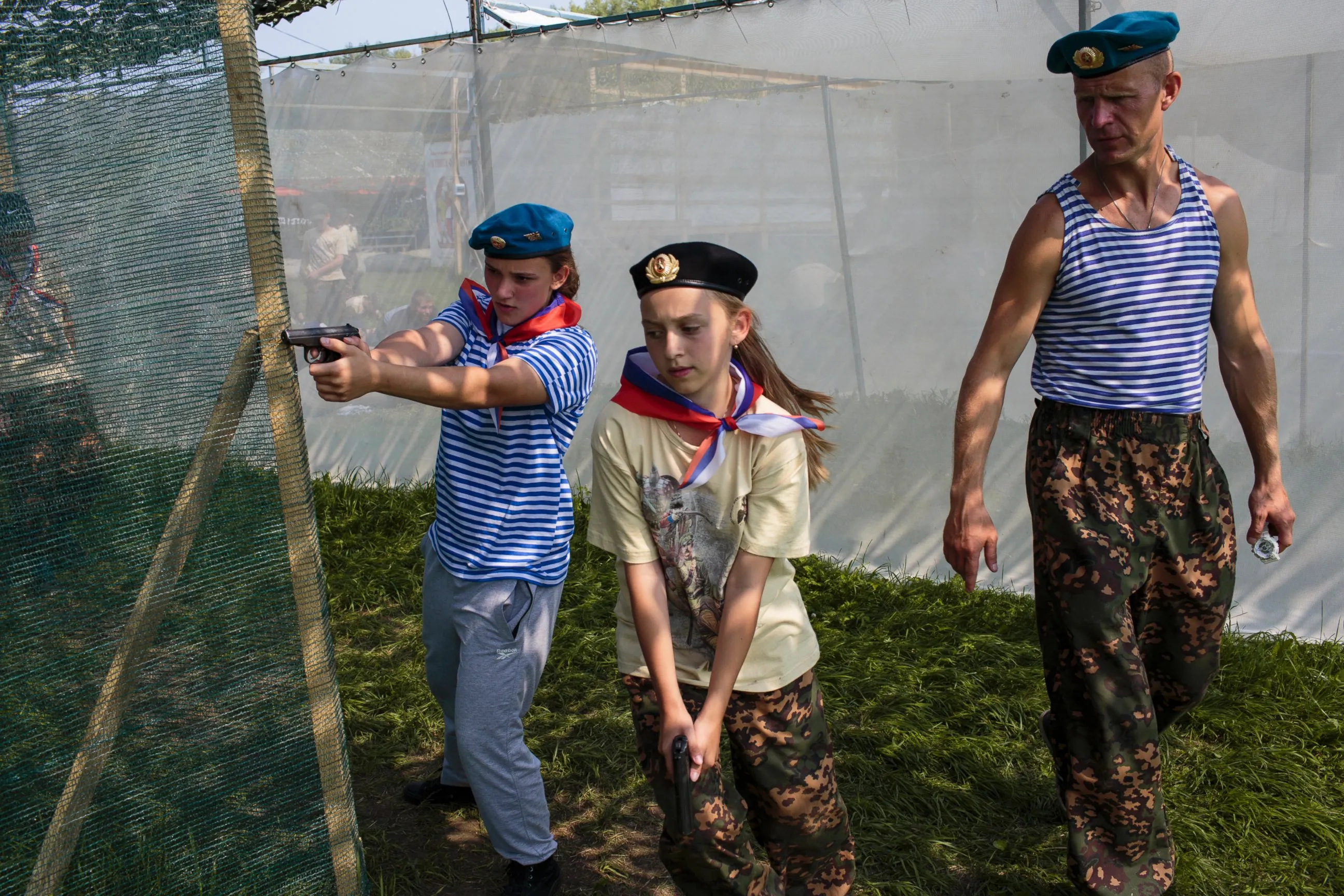 Students dressed in traditional shirts and hats of the Russian air force participate in a firearm drill at the Historical-War Camp, in Borodino, Russia, July 25, 2016. (Photo by Sarah Blesener)