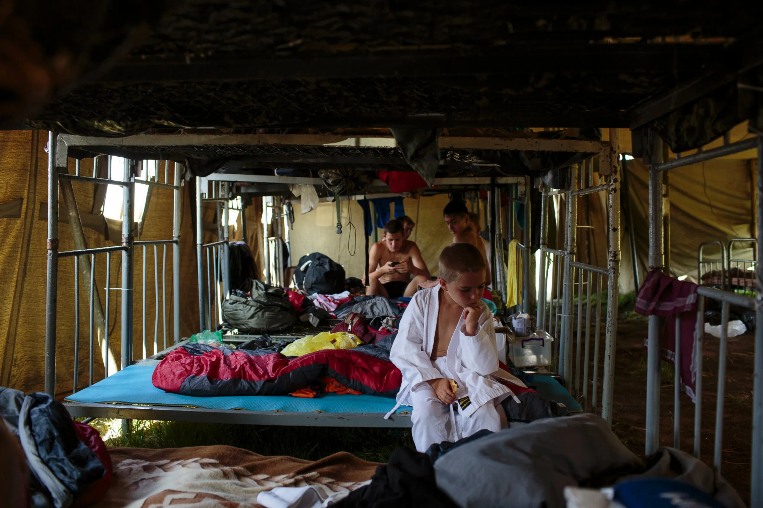 Students from Stavropol rest in their tent after the first day of hand-combat competition. (Photo by Sarah Blesener)