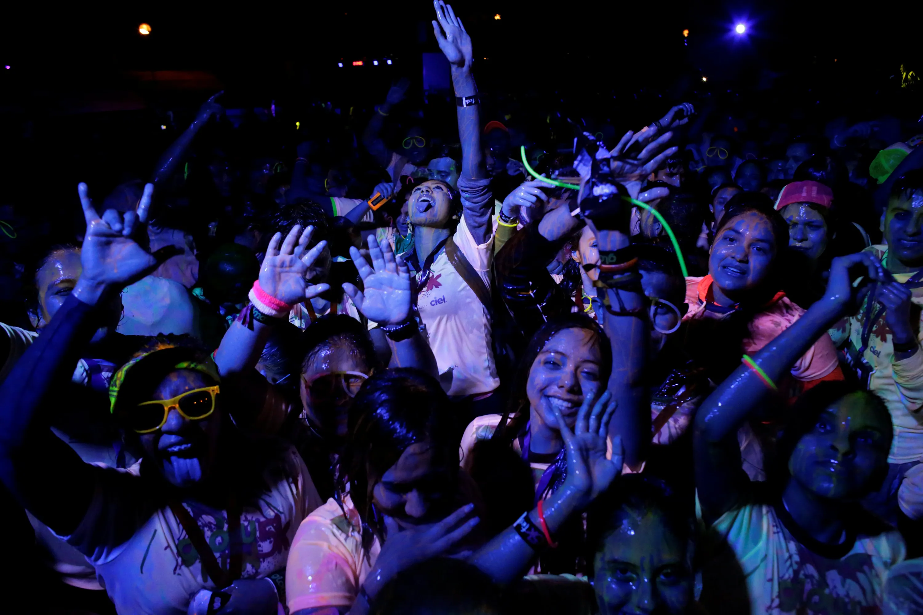 Participants dances after a nocturnal 5K color glow party run in Monterrey, Mexico November 19, 2016. Pictures taken on November 19, 2016. (Photo by Daniel Becerril/Reuters)