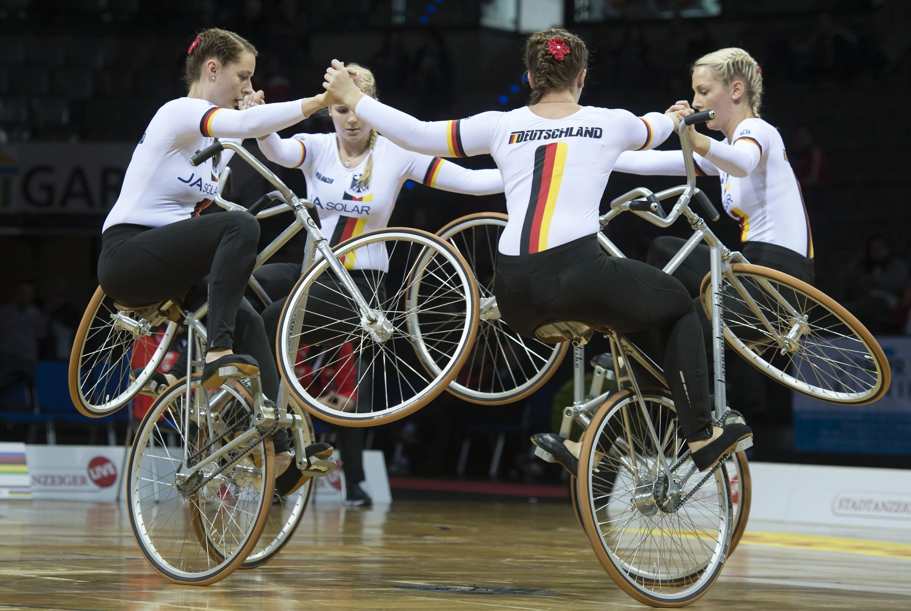 Germany's team with (L-R) Katharina Guellich, Christine Posch, Ramona Strassner and Ramona Ressel perform in the Act 4 Open competition during the UCI Indoor Cycling World Championships in Stuttgart, southwestern Germany, on December 2, 2016. (Photo by Thomas Kienzle/AFP Photo)