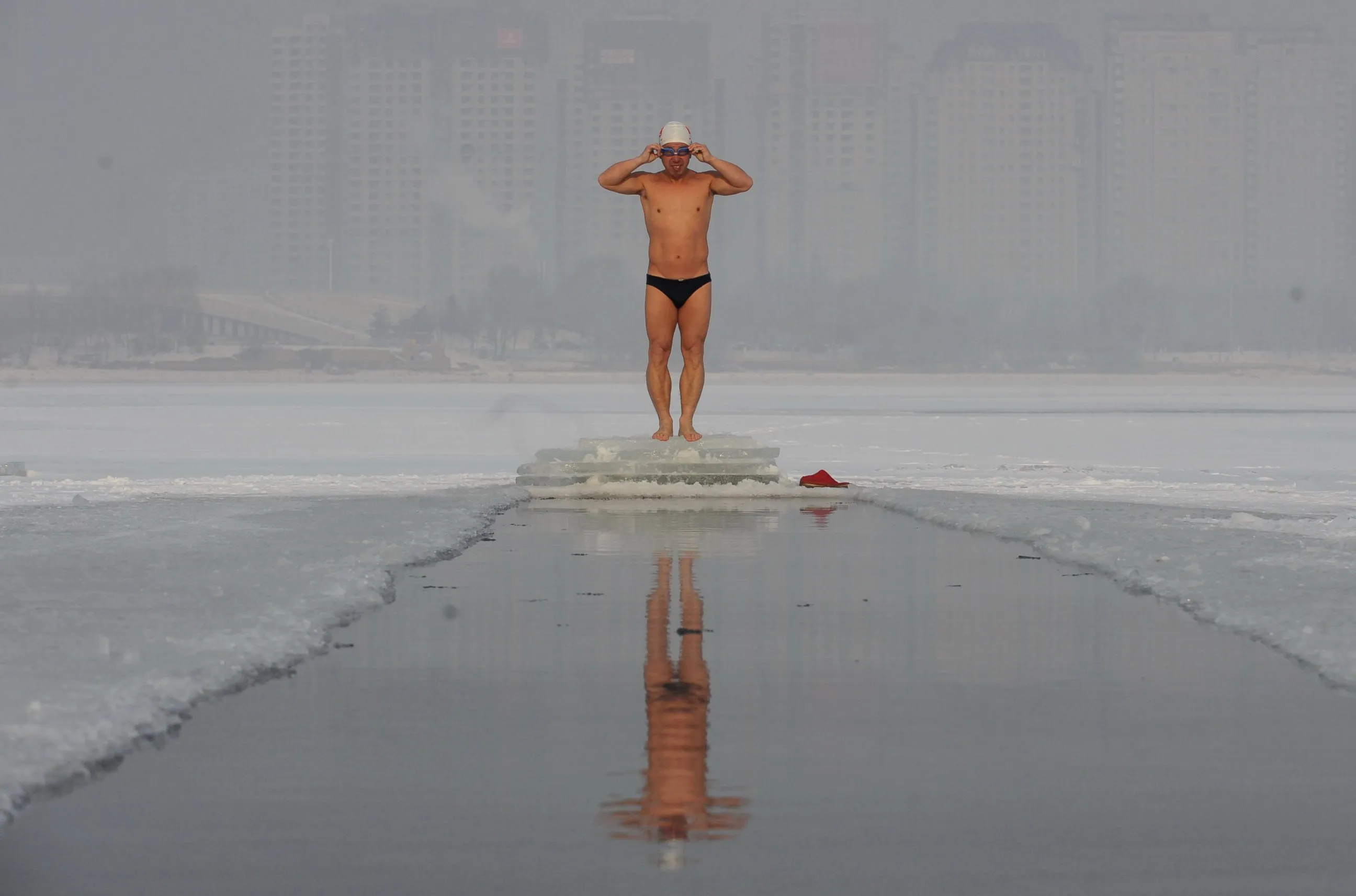 A winter swimmer prepares for a swim in a pool dug out on the ice-covered river in Shenyang in northeast China's Liaoning province, December 15, 2016. (Photo by FeatureChina/Newscom)