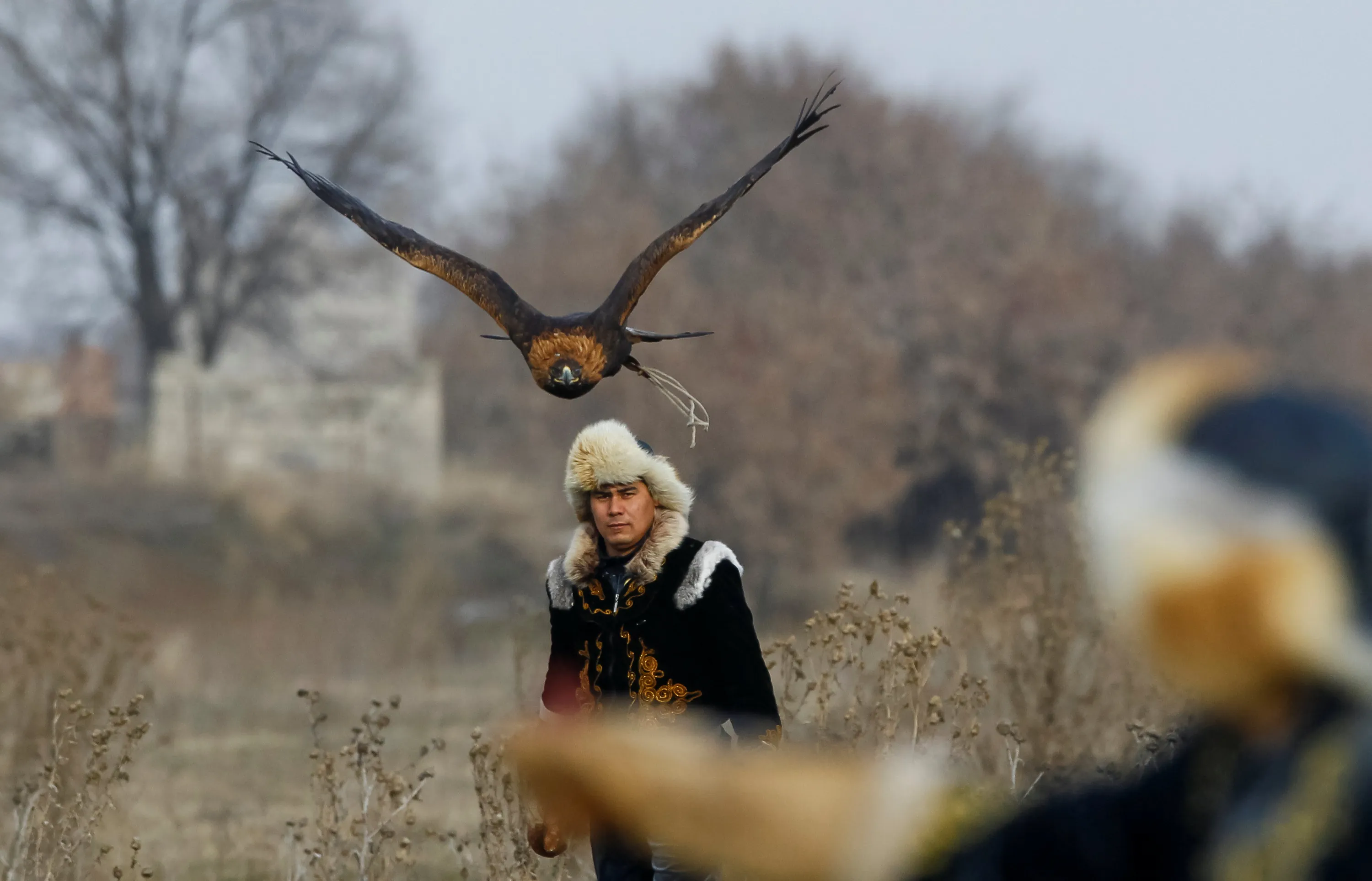 Arman Kushkarov, a hunter with a golden eagle, looks on after he released his tamed bird during training outside of the village of Shamalgan, in Almaty region, Kazakhstan, December 14, 2016. (Photo by Shamil Zhumatov/Reuters)