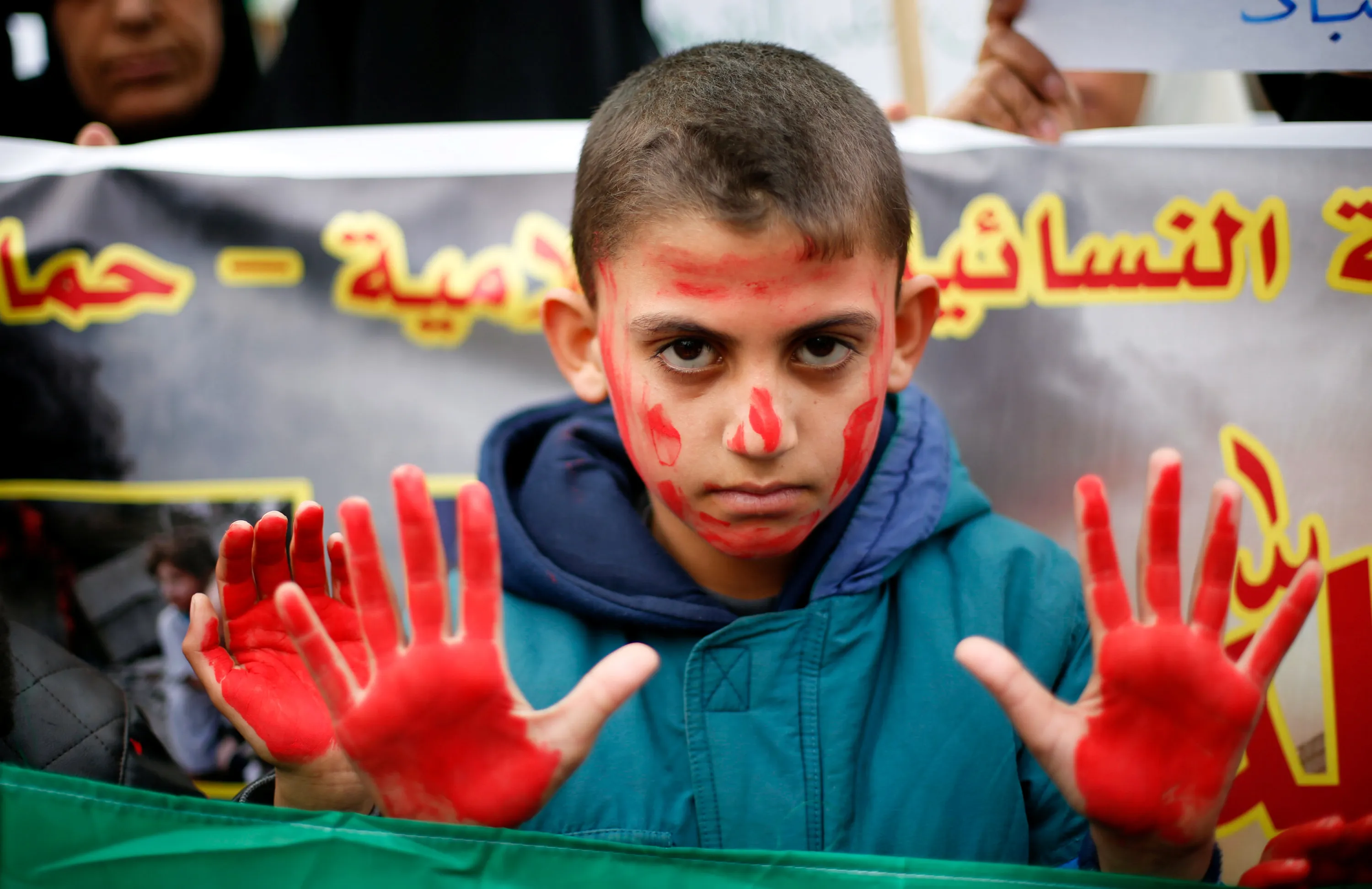 A Palestinian boy covered with ink gestures during a protest to show solidarity with trapped citizens of Aleppo, Syria, in Gaza city December 15, 2016. (Photo by Suhaib Salem/Reuters)