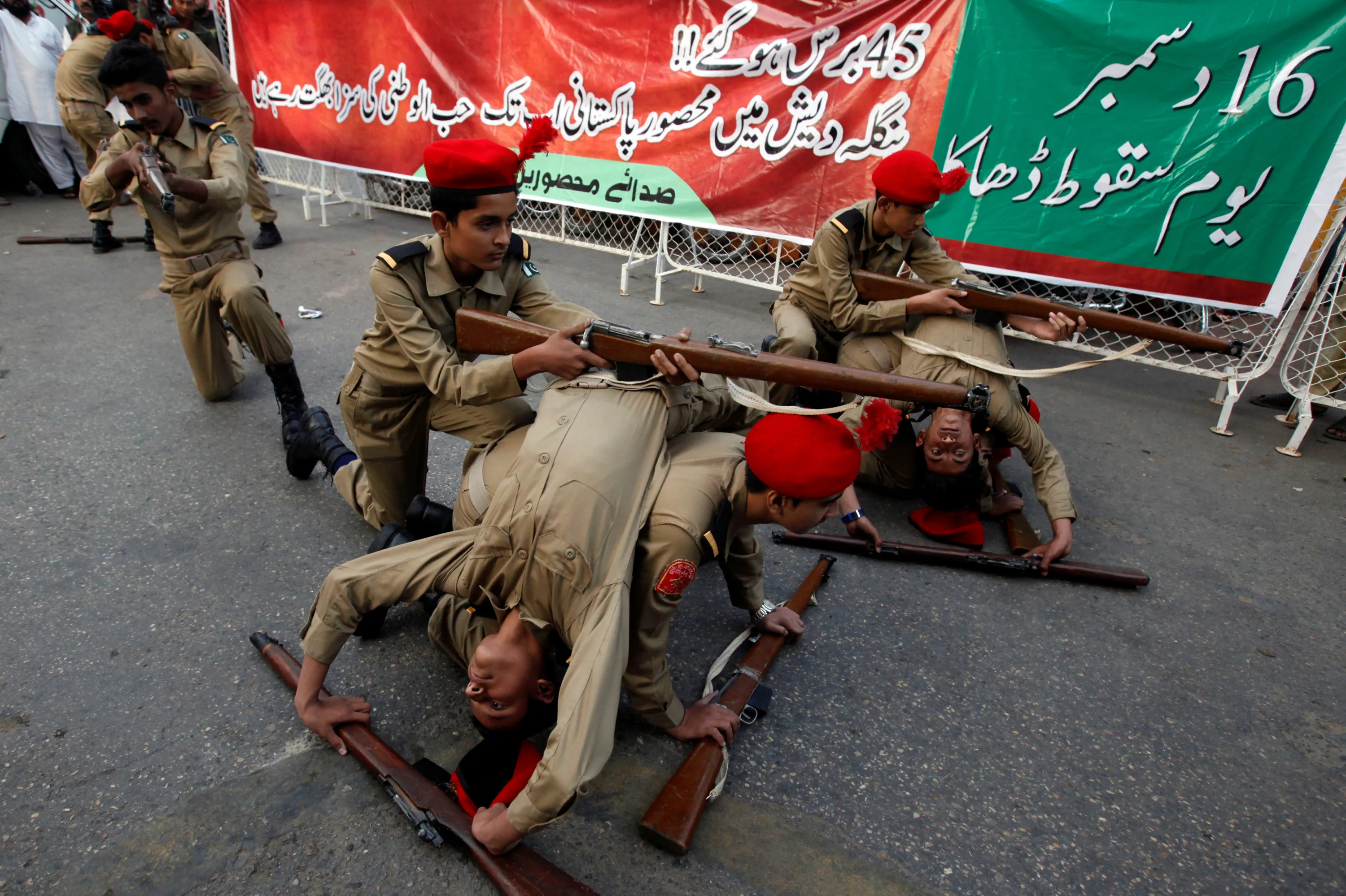 School children in uniform perform, in commemoration of the victims of an attack on the Army Public School in 2014, during a demonstration in Karachi, Pakistan, December 16, 2016. (Photo by Akhtar Soomro/Reuters)