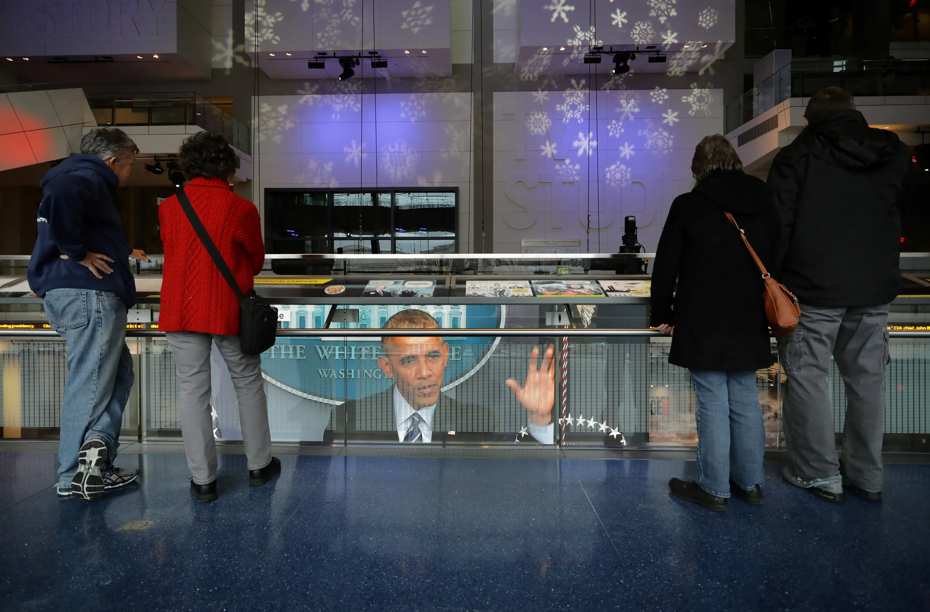 People watch U.S. President Barack Obama on a large screen inside the Newseum as he participates in his last news conference of the year in Washington, U.S., December 16, 2016. (Photo by Kevin Coombs/Reuters)