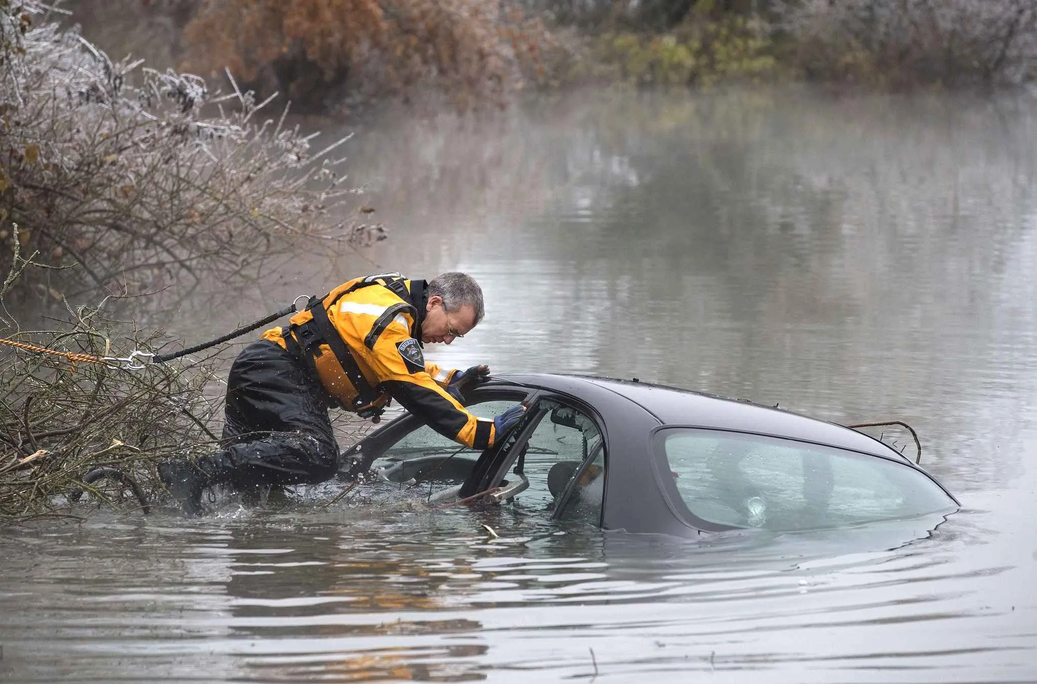 A Lane County Sheriffs deputy works to remove a car that crashed in the Maxwell pond on Northwest Express Way in Eugene, Ore., Thursday, December 15, 2016. (Photo by Collin Andrew/The Register-Guard via AP Photo)