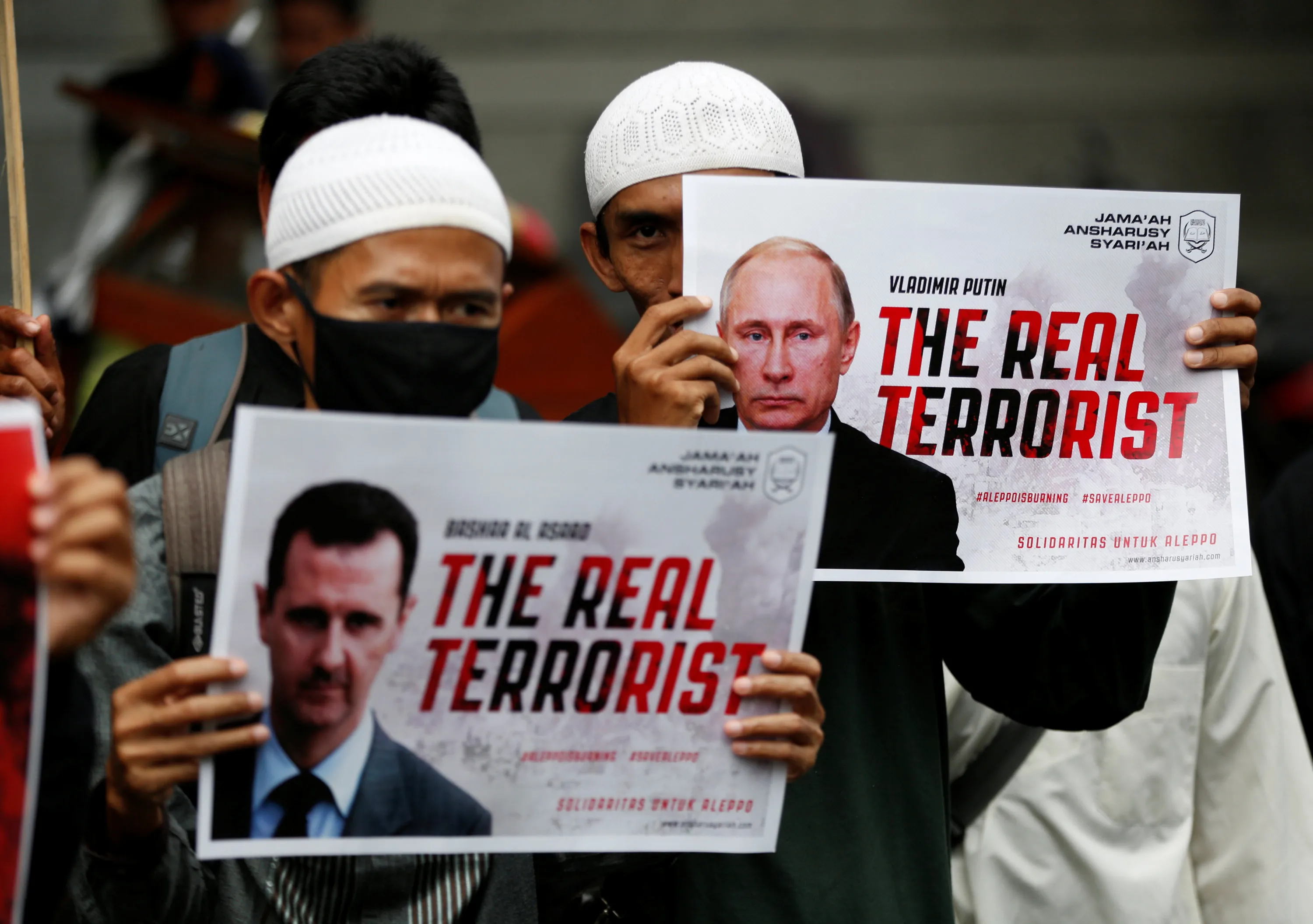 Muslim men hold placards during a protest calling for an end to the violence in Aleppo, Syria outside the Russian embassy in Jakarta, Indonesia December 19, 2016. (Photo by Darren Whiteside/Reuters)