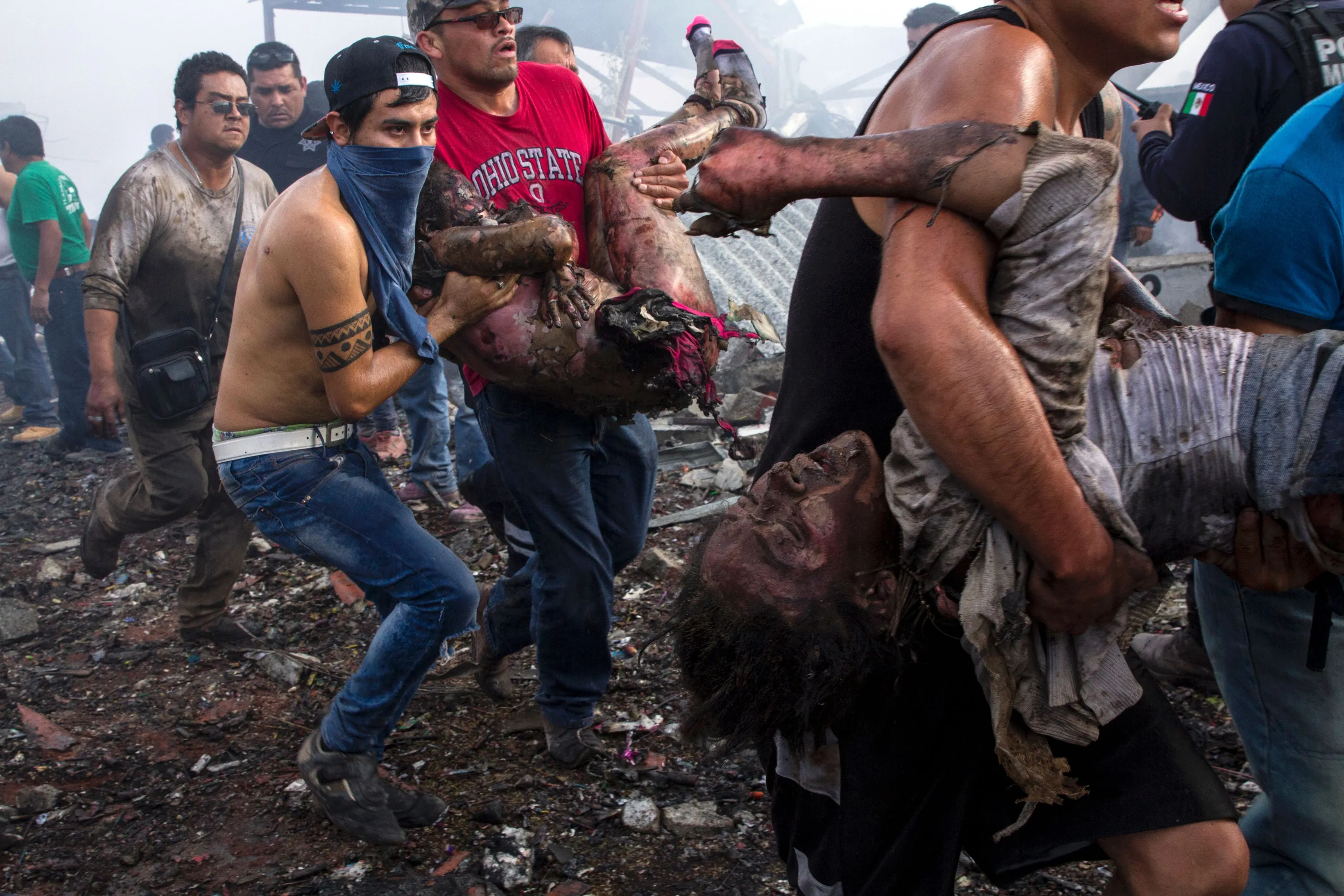 Victims severely burned are taken away by rescuers from the smoldering ruins of a fireworks market, flattened by a huge blast that killed at least 26 and injured dozens, in Mexico City, on December 20, 2016. The conflagration, in the suburb of Tultepec, set off a quickfire series of multicolored blasts and a vast amount of smoke that hung over Mexico City. (Photo by Israel Gutierrez/AFP Photo)