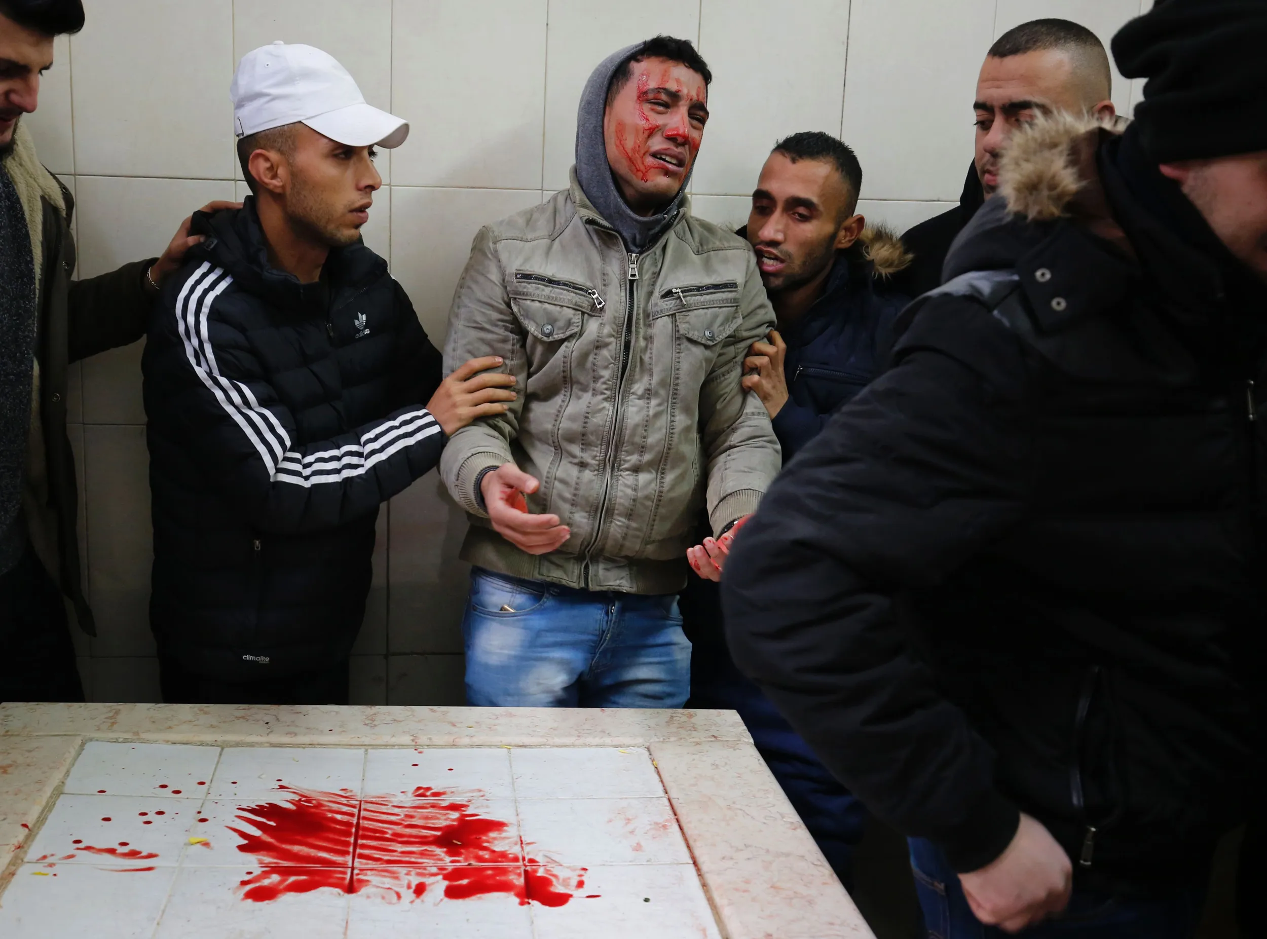 A Palestinian mourner reacts after spreading on his face the blood of Ahmad al-Kharoubi, 19, who was shot and killed during clashes with Israeli soldiers on December 22, 2016, before his funeral in the West Bank city of Ramallah. The Palestinian man was killed during clashes with Israeli soldiers overnight as they arrived to demolish the home of the alleged perpetrator of a deadly attack on Israelis, the army said. (Photo by Abbas Momani/AFP Photo)