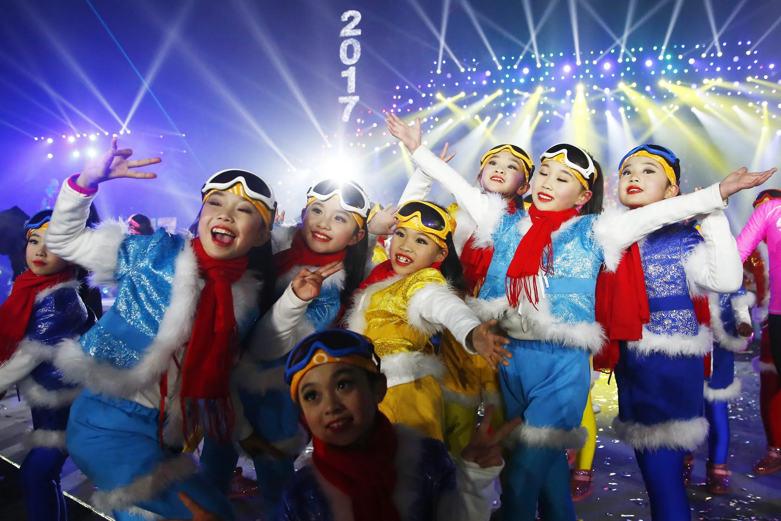 Performers gather and pose for photograph as they attend the count down event to celebrate the arrival 2017 new year during New Year's Eve celebration at Beijing Olympic Park in Beijing city, China, 01 January 2017. (Photo by Wu Hong/EPA)