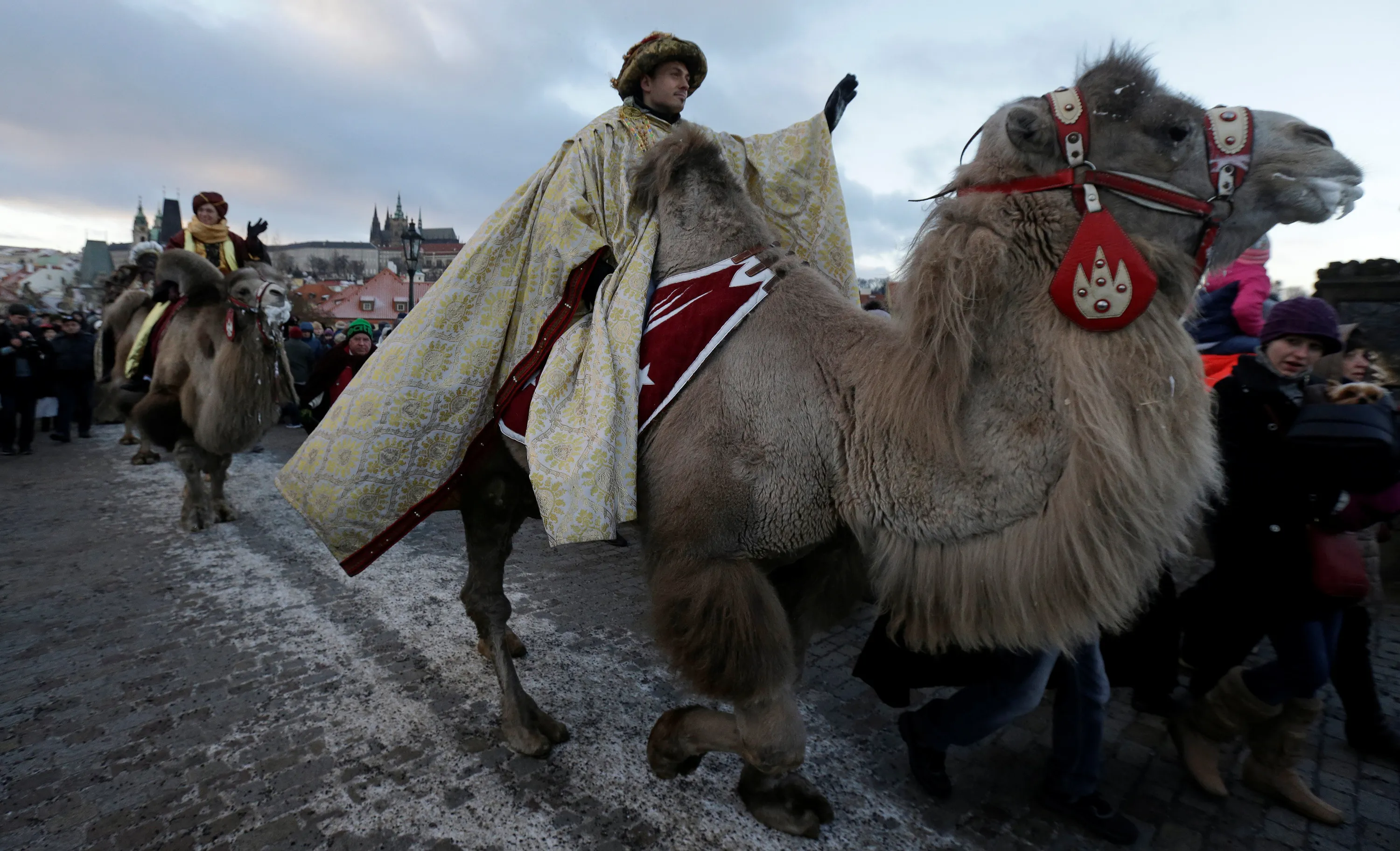 Men dressed as the Three Kings greet spectators as they ride camels during the Three Kings procession across the medieval Charles bridge, as a part of a re-enactment of the Nativity scene, in Prague, Czech Republic January 6, 2017. (Photo by David W. Cerny/Reuters)