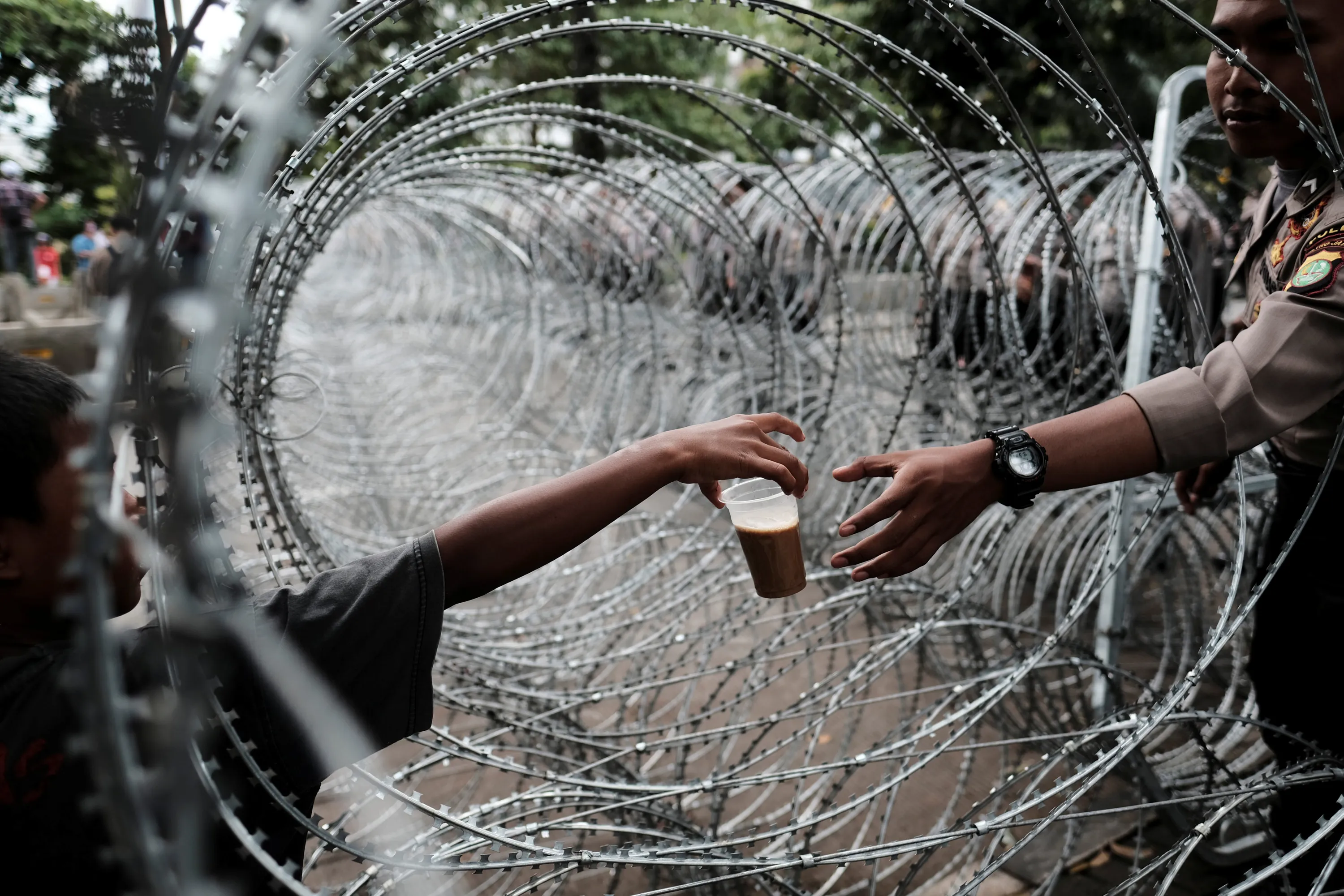 An Indonesian policeman buys a drink as he stands guard near the barbwire outside a court at the blasphemy trial of Jakarta's incumbent governor Basuki Tjahaja Purnama, also known as Ahok, in Jakarta, Indonesia January 10, 2017. (Photo by Reuters/Beawiharta)