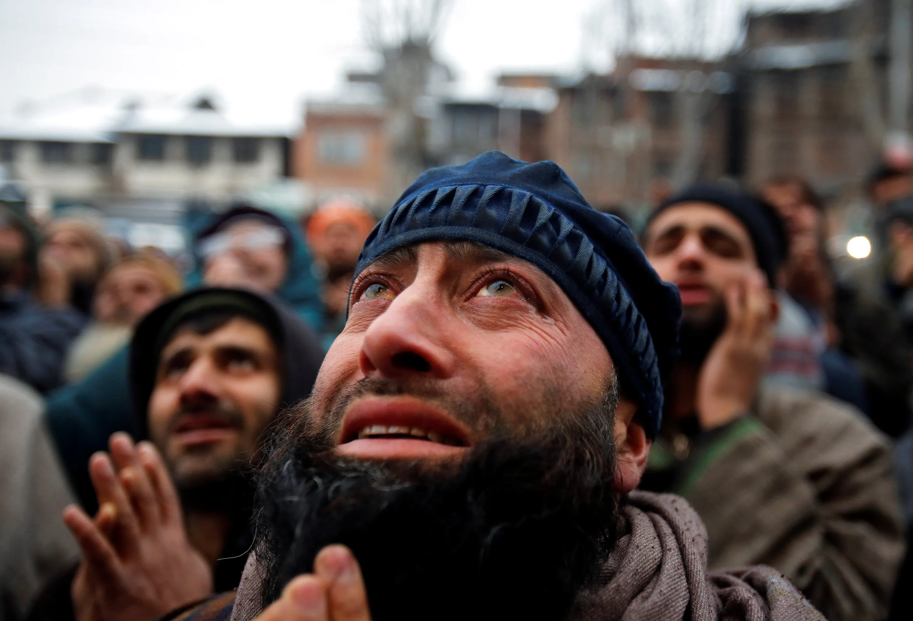 Kashmiri Muslim men raise their arms upon seeing a relic of Sheikh Abdul Qadir Jilani, a Sufi saint, being displayed at his shrine on the occasion of his death anniversary, on a cold winter morning in Srinagar, January 10, 2017. (Photo by Danish Ismail/Reuters)