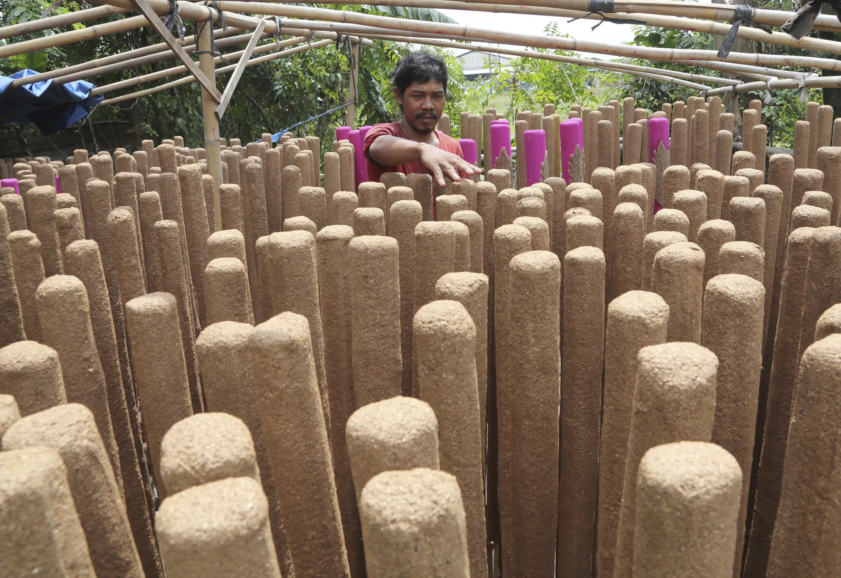 A worker arranges large incense sticks to be sold for the preparation of the Lunar New Year in Tangerang, Indonesia, Tuesday, January 10, 2017. Ethnic Chinese communities in the world's most populous Muslim country are preparing to celebrate the start of the year of the rooster. (Photo by Tatan Syuflana/AP Photo)