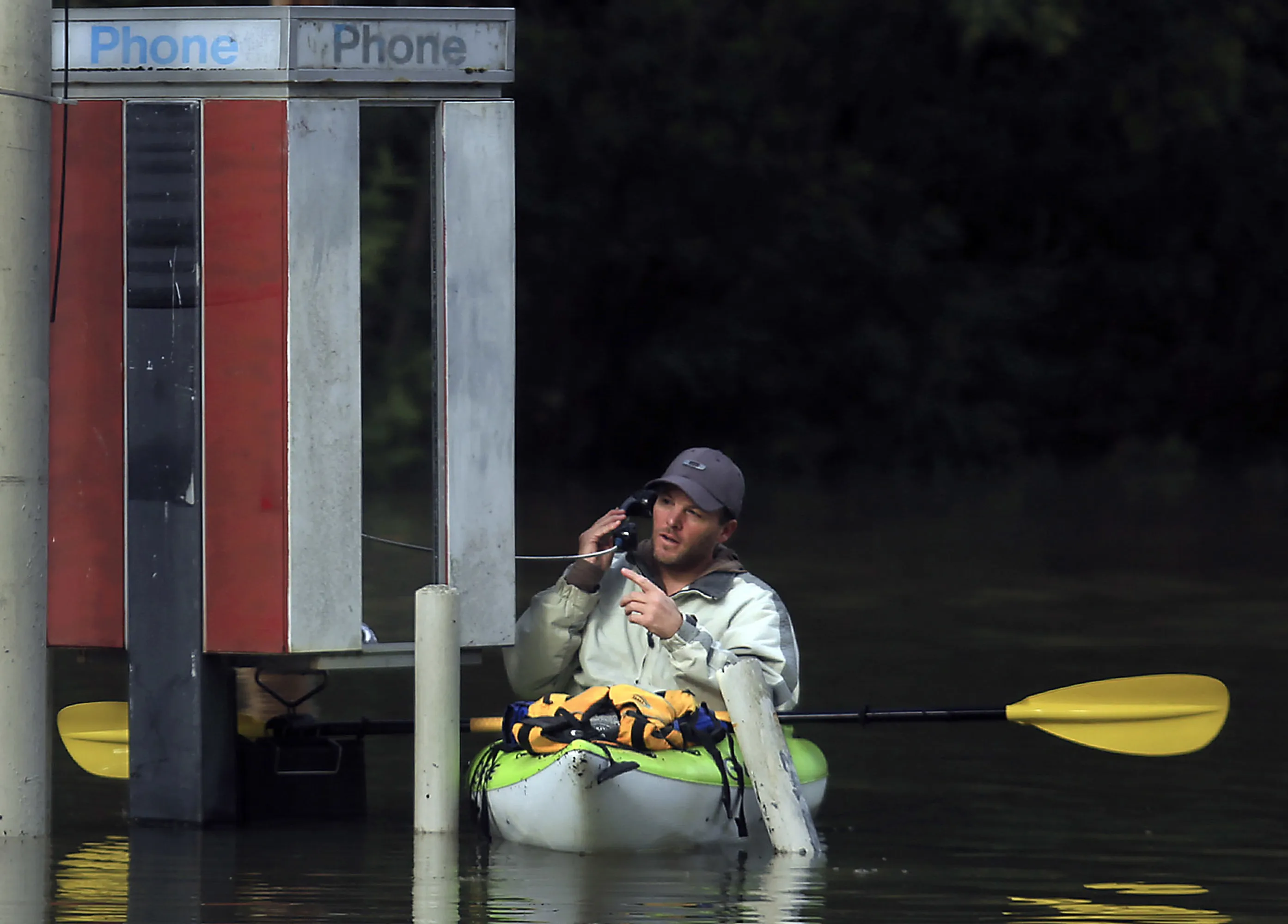 With Russian River waters rising, Dustin Coupe of Guerneville talks with an operator via phone booth on River Road in Guerneville, Calif., Wednesday. January 11, 2017. Dozens of Northern California residents have been rescued by boats and firetrucks from flooded homes near Hollister, California as a drought-busting series of storms moved out of the region. Days of rain and snow have toppled trees and forced people out of water-logged homes. (Photo by Kent Porter/The Press Democrat via AP Photo)