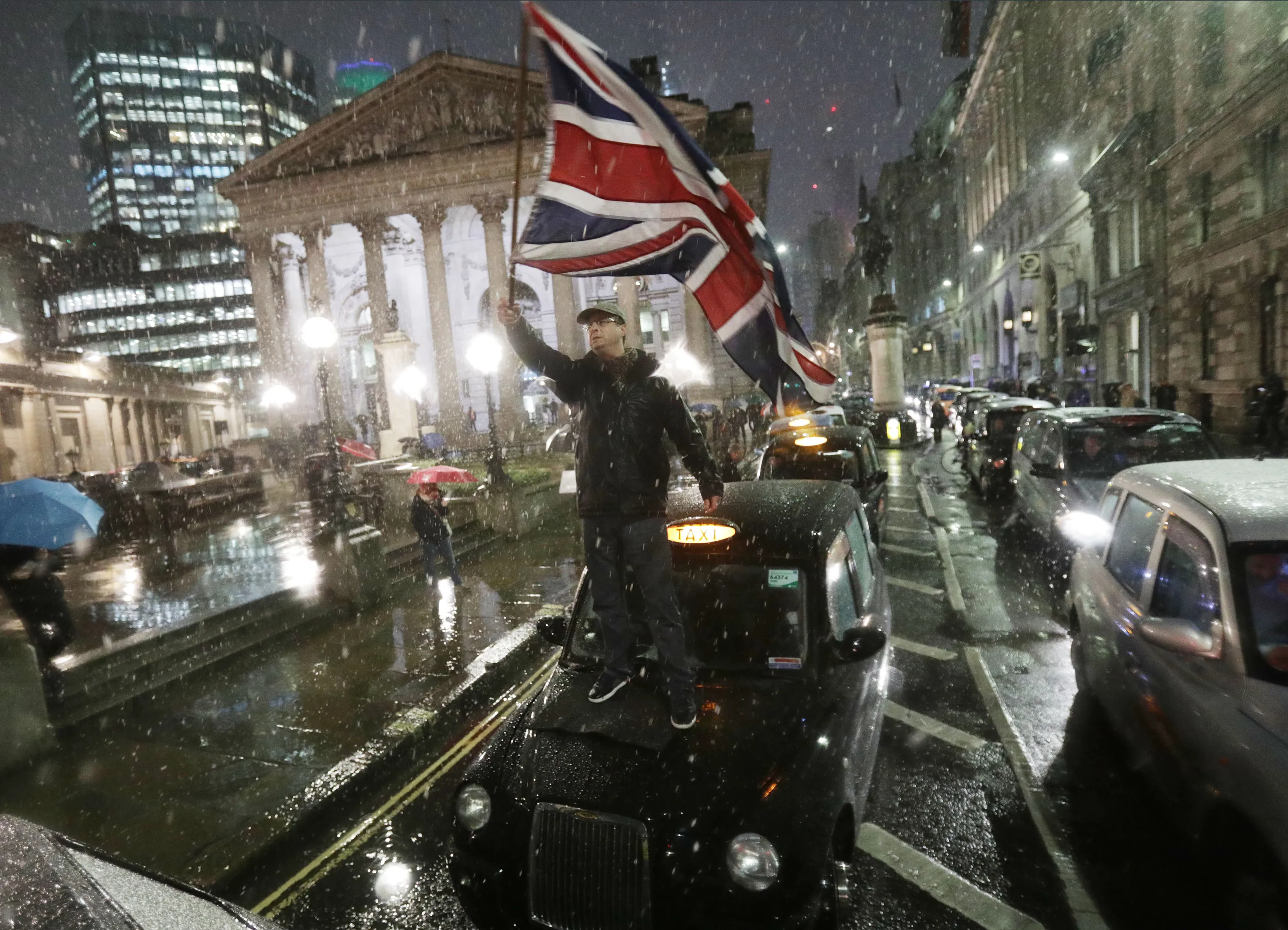 A Taxi drivers' protest gridlocks Bank junction in London's financial district with their black cabs, forcing cyclists and pedestrians to weave around the stopped vehicles during the first UK snows of the winter, on 12th January 2017, in the City of London, England. The drivers are protesting that taxis and other traffic will be banned from here, one of Londons most notorious junctions in a ground-breaking road safety measure to start in April. Only cyclists and buses will be allowed to use Bank junction between the hours of 7am and 7pm after the City of London Corporation after a series of cycling deaths at this location, (Photo by Yui Mok/PA Wire)