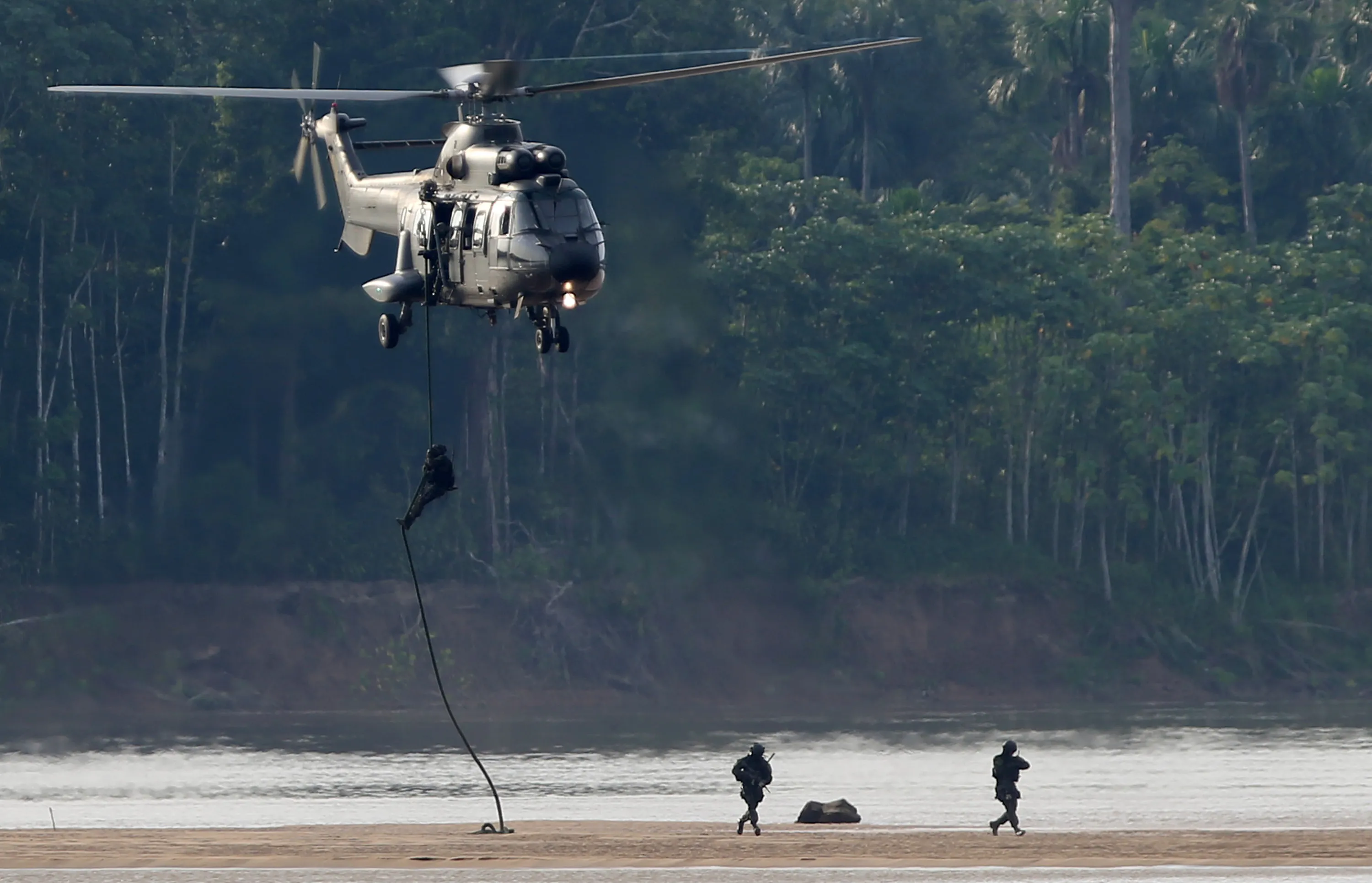 An army helicopter patrols the border with Colombia during a training to show efforts to step up security along borders, in Vila Bittencourt, Amazon State, Brazil, January 18, 2017. (Photo by Adriano Machado/Reuters)