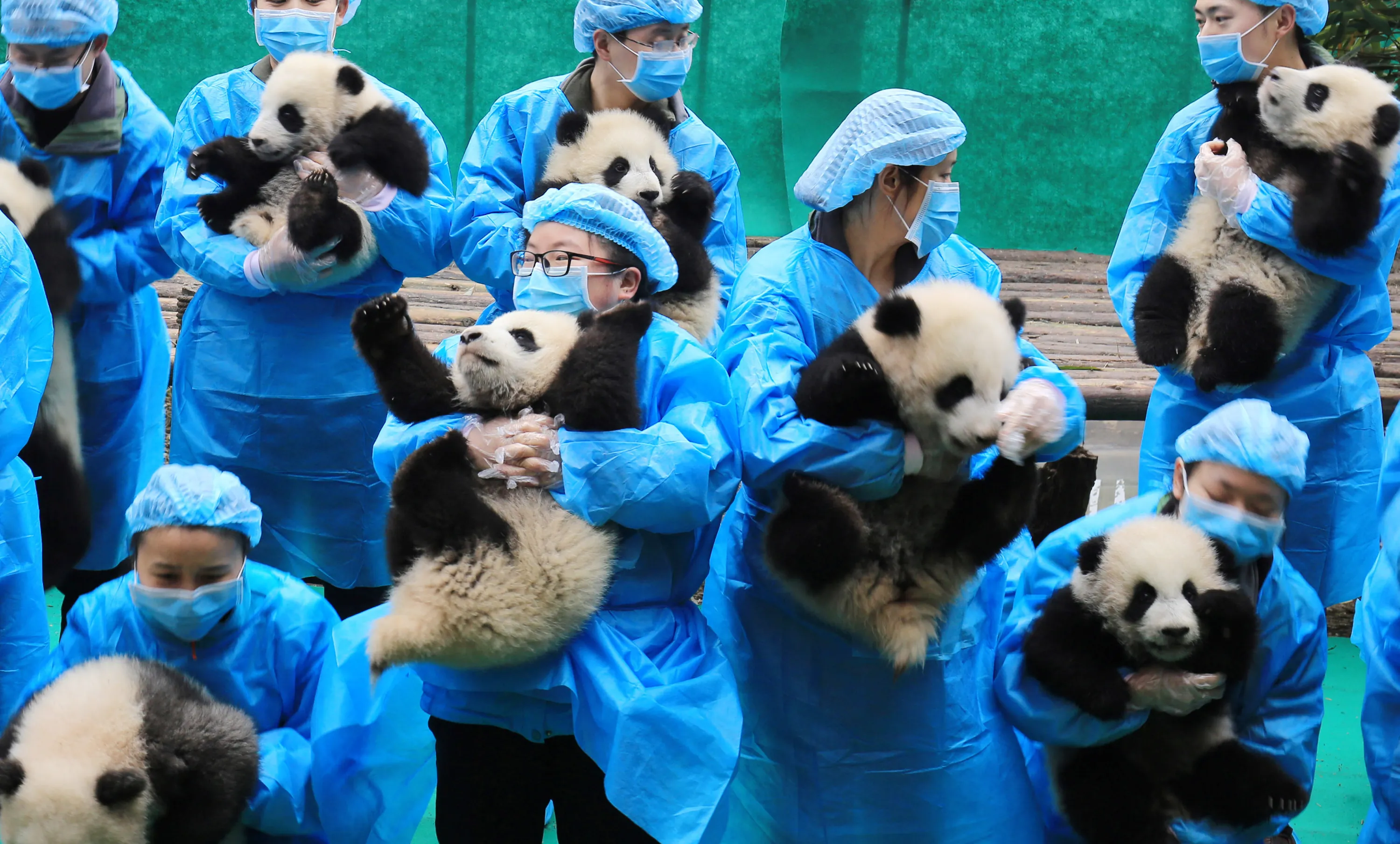Breeders hold baby giant pandas as they pose for pictures ahead of the Spring Festival in Chengdu, Sichuan province, China, January 20, 2017. (Photo by Reuters/China Daily)