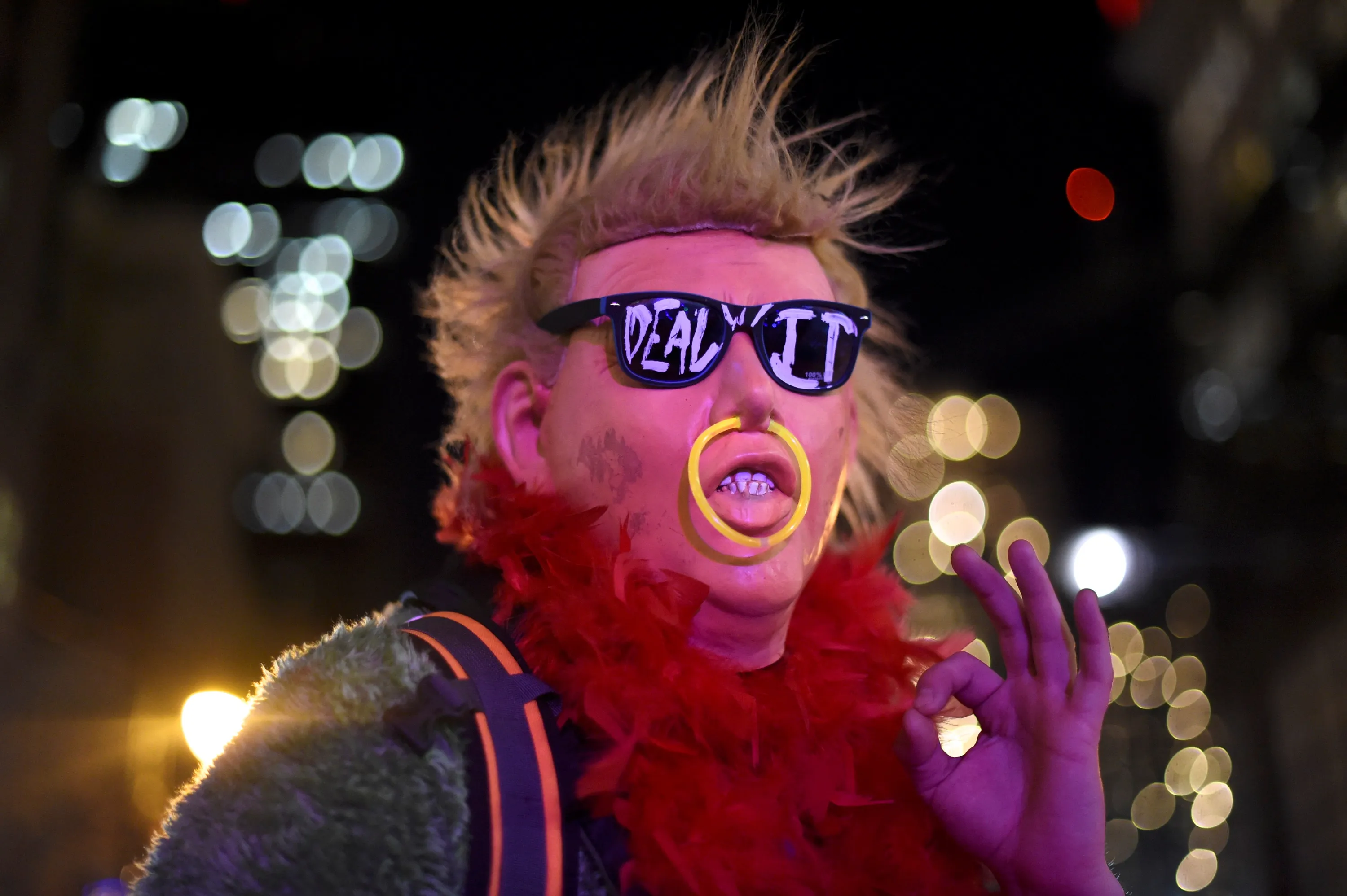A protester wearing a Donald Trump mask demonstrates during a “Queer Rage” dance party outside the location of the 2017 “Congress of Tomorrow” Joint Republican Issues Conference in Philadelphia, Pennsylvania, U.S. January 25, 2017. (Photo by Mark Makela/Reuters)
