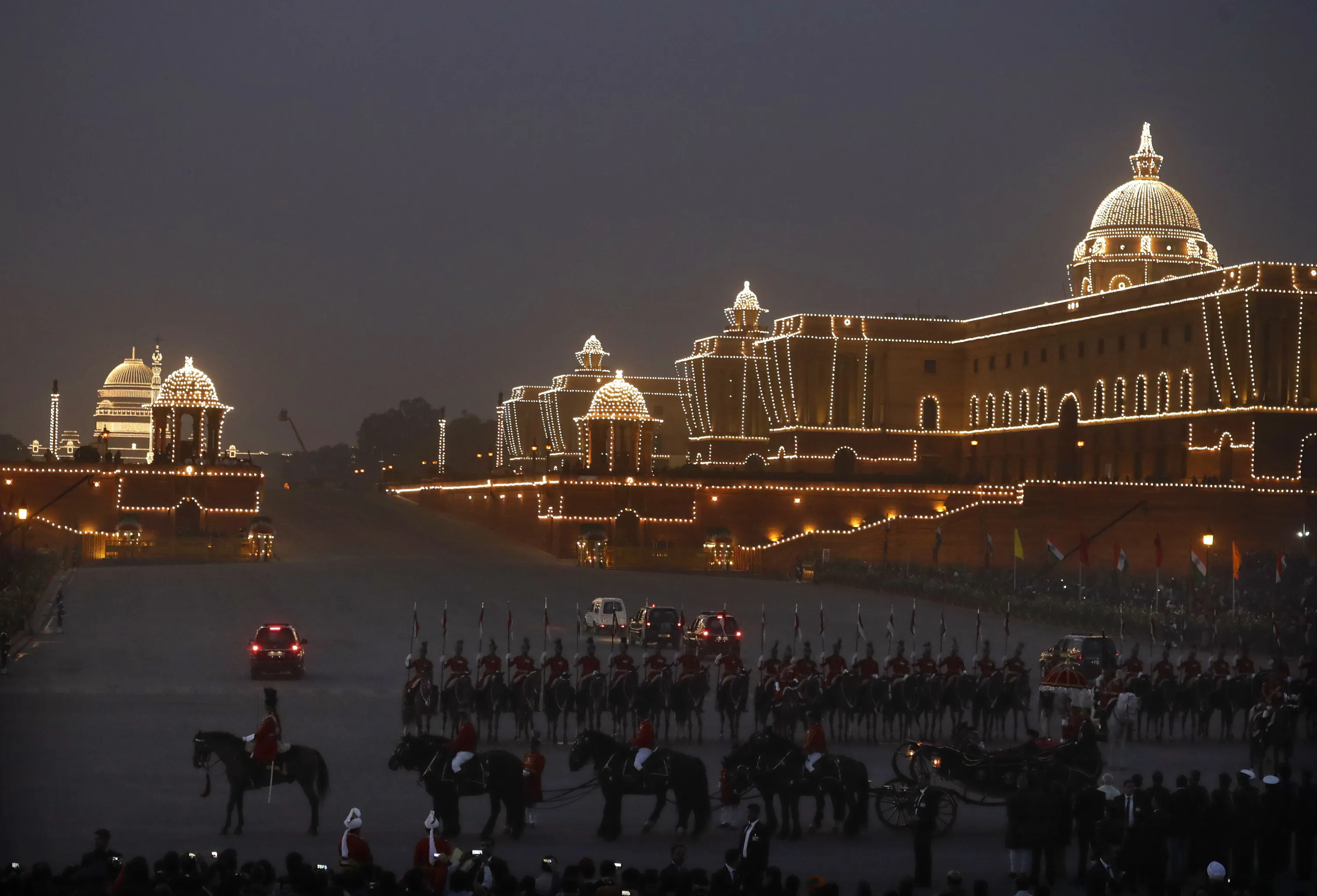 Indian President Pranab Mukherjee leaves at the end of Beating Retreat ceremony against illuminated Raisina hills, the government seat of power, in New Delhi, India, Sunday, January 29, 2017. The ceremony marks the end of Republic Day festivities. (Photo by AP Photo)