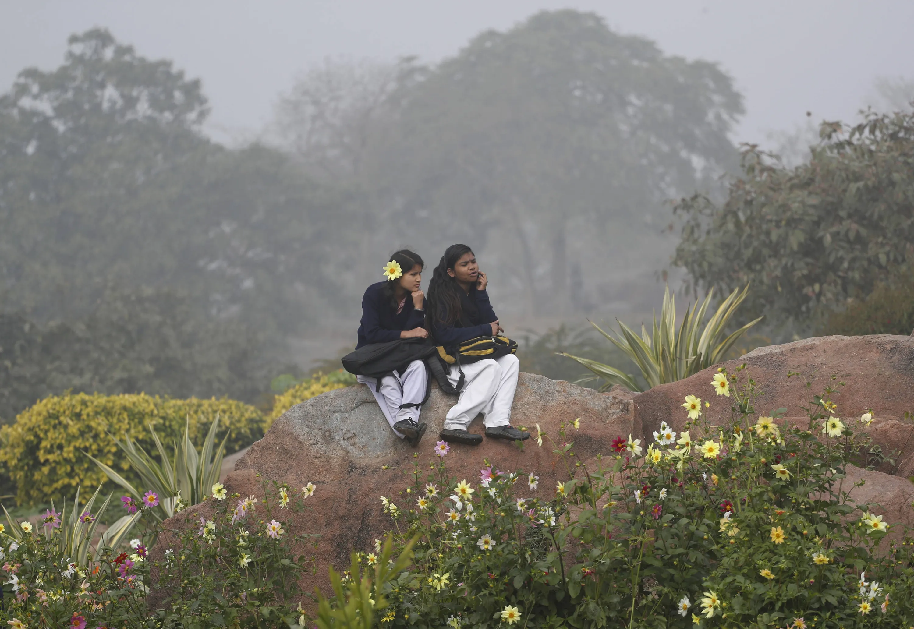 Indian school girls sit in a park on a foggy morning in New Delhi, India, Monday, January 30, 2017. Thick fog engulfs many parts of the country during the winter months and disturbs air, rail and road services. (Photo by Tsering Topgyal/AP Photo)