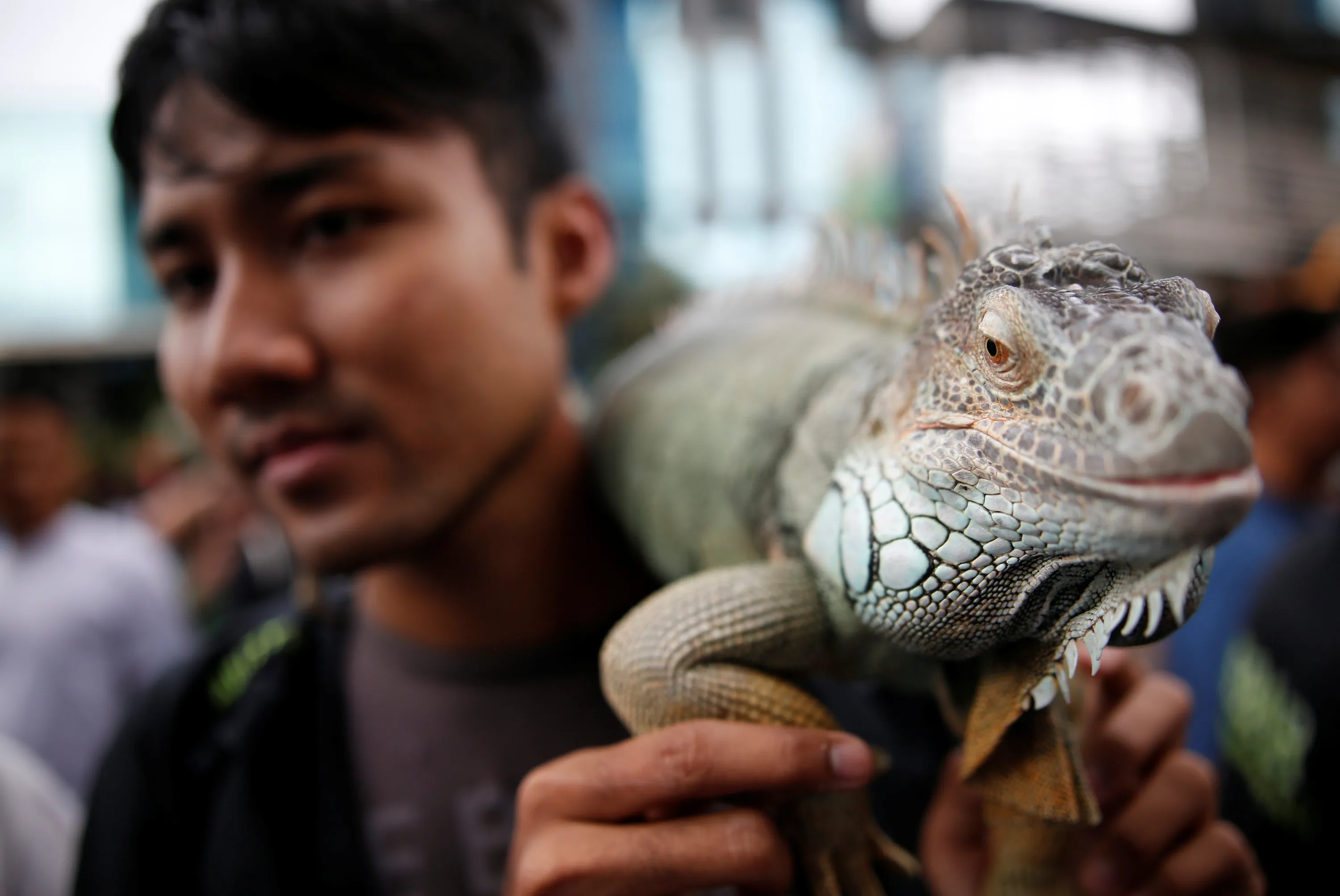 A member of a reptile club holds an iguana during a gathering on a car-free day in central Jakarta, Indonesia February 5, 2017. (Photo by Darren Whiteside/Reuters)
