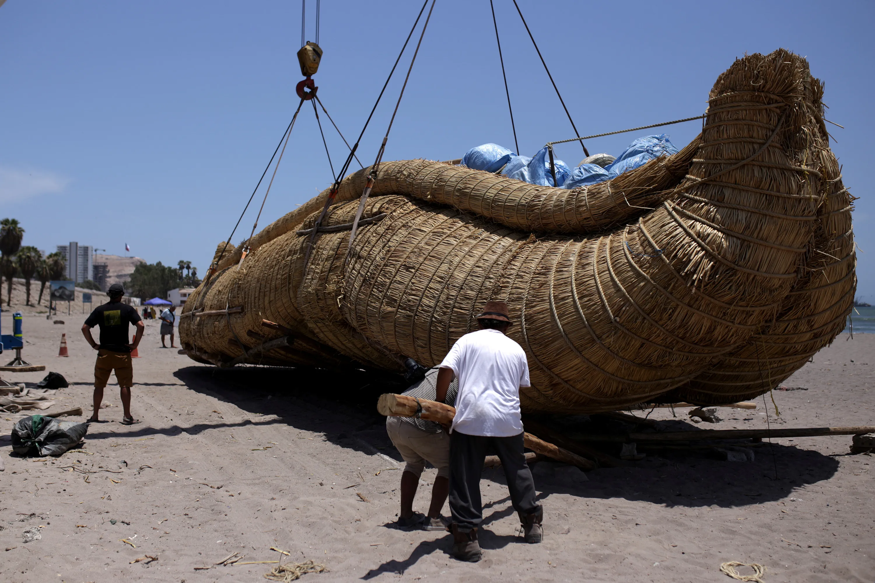 A man holds up a piece of wood as the “Viracocha III”, a boat made only from reeds, is lifted onto a beach on the Pacific shores of northern Chile as part of its preparation to reach Australia on an estimated six-month journey, in Arica, Chile February 14, 2017. (Photo by Ibar Silva/Reuters)