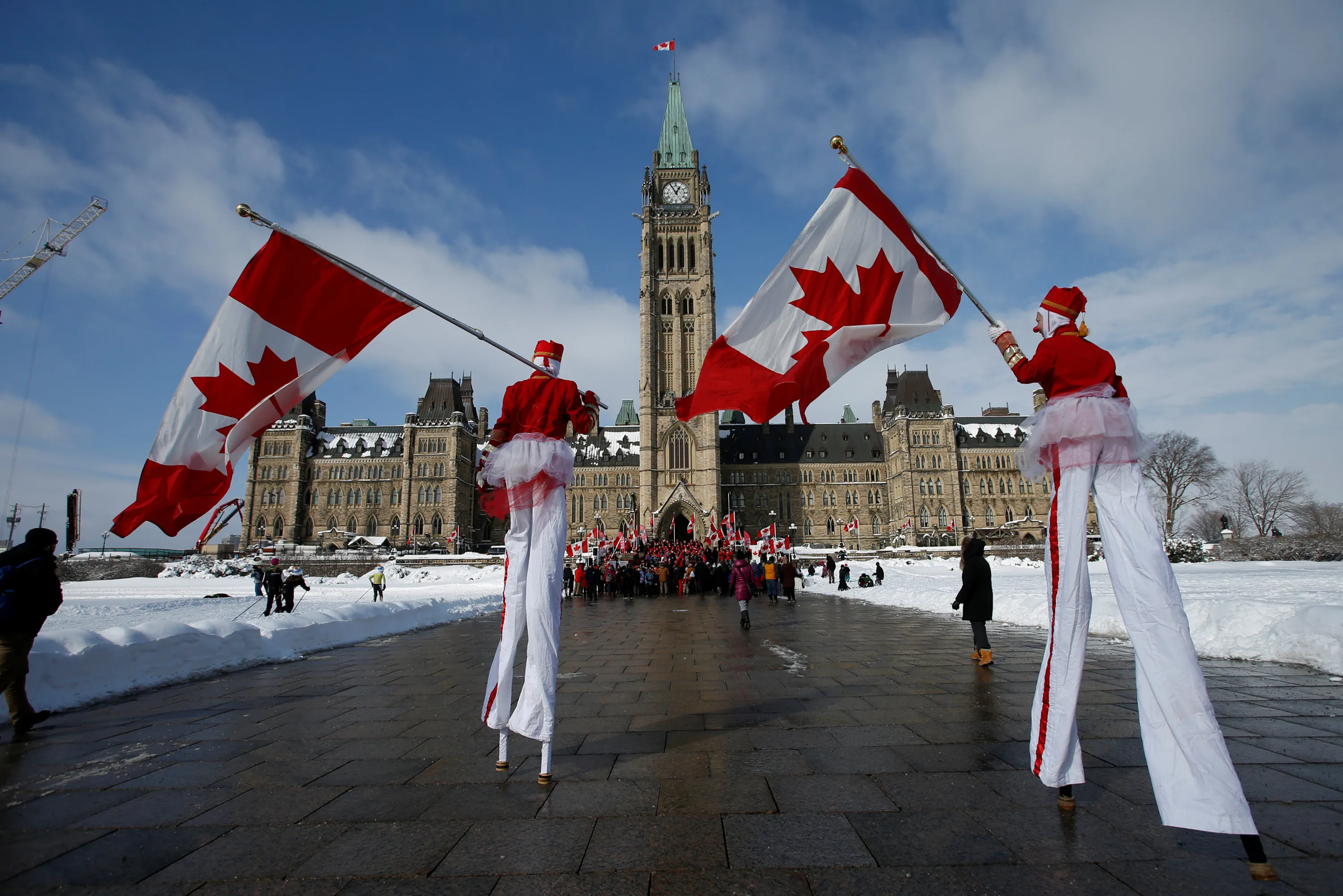 Performers on stilts carry Canadian flags as they arrive for a National Flag of Canada Day ceremony on Parliament Hill in Ottawa, Ontario, Canada February 15, 2017. (Photo by Chris Wattie/Reuters)