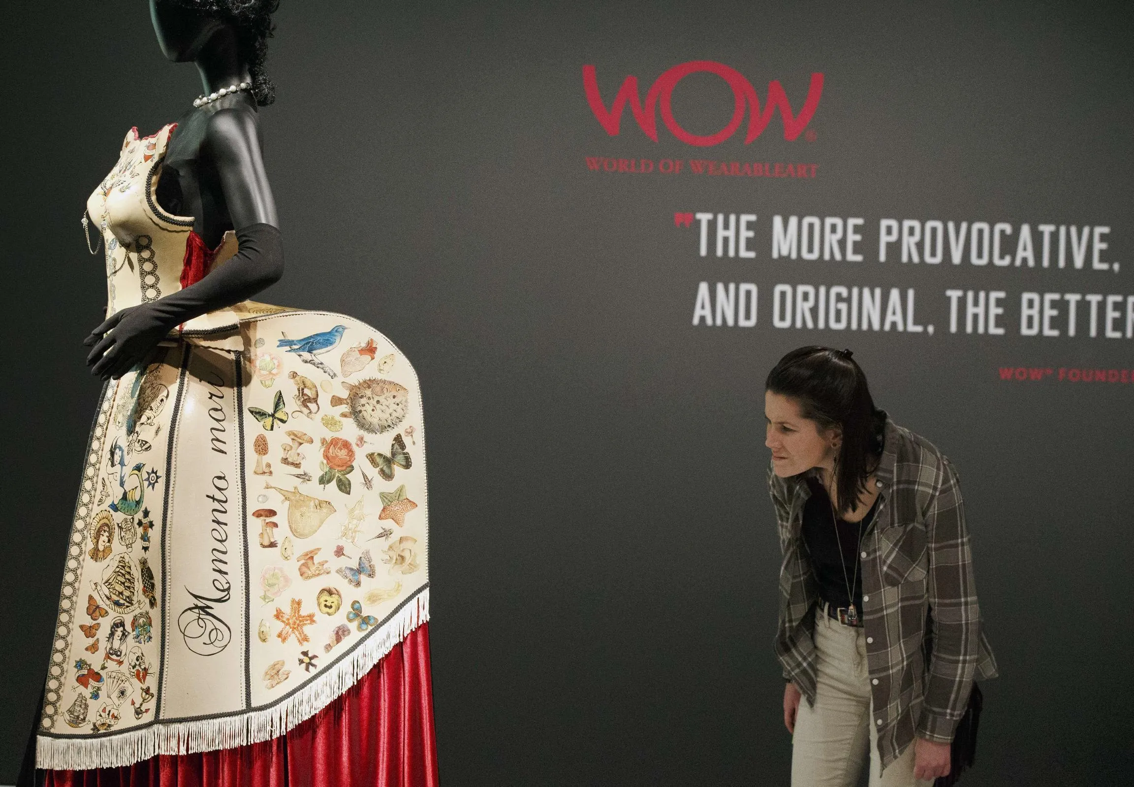 In this Thursday, February 16, 2017 photo, a woman examines a piece entitled “Lady Curiosity” by Fifi Colston, which is part of The “WOW – World of Wearable Art” show at the Peabody Essex Museum in Salem, Mass. (Photo by Michael Dwyer/AP Photo)