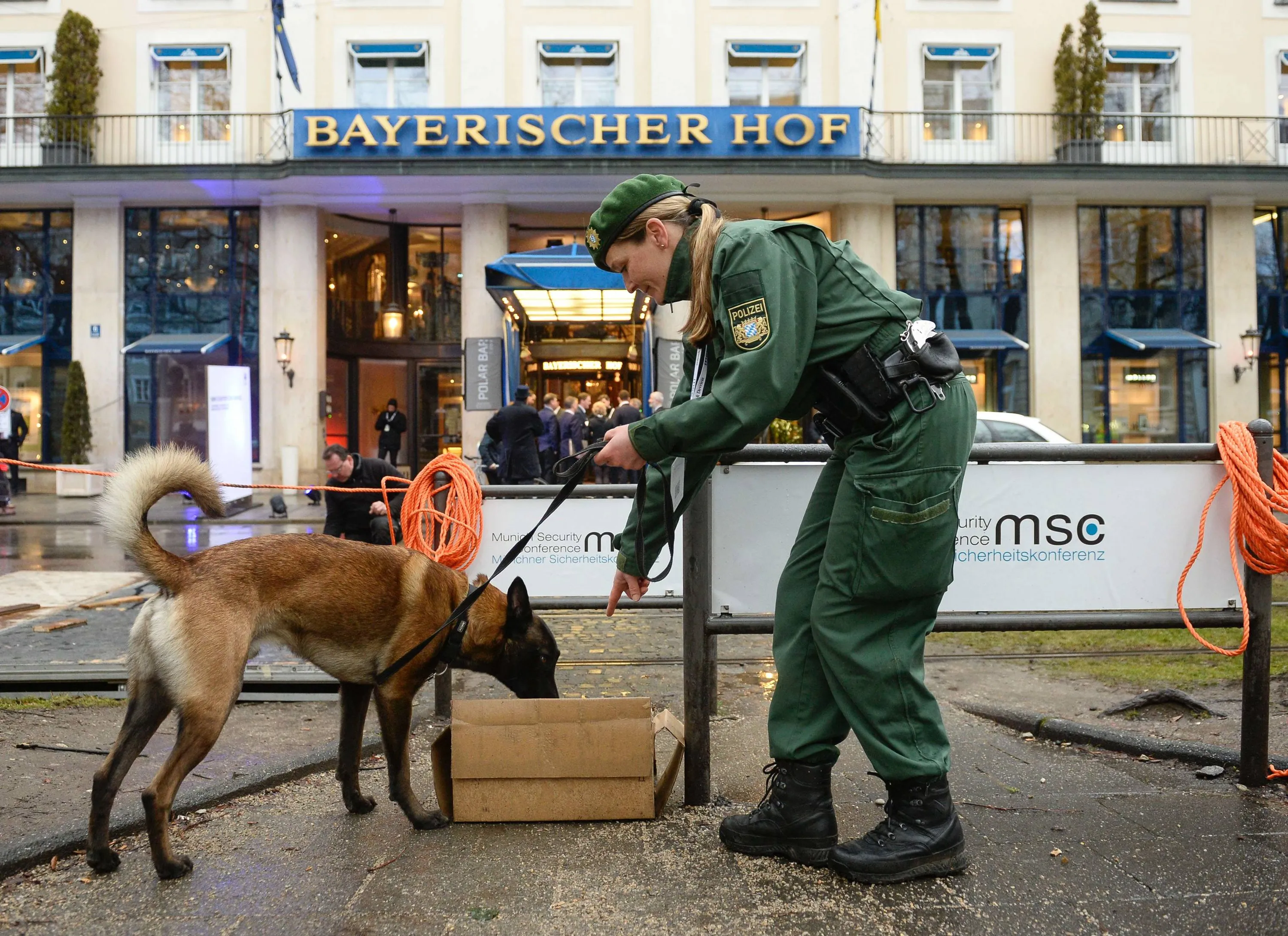 Police dog Alfi and his mistress do their work in front of the Bayerischer Hof hotel in Munich, southern Germany, on February 17, 2017, where preparations are under way for the high-profile Munich Security Conference. (Photo by Thomas Kienzle/AFP Photo)