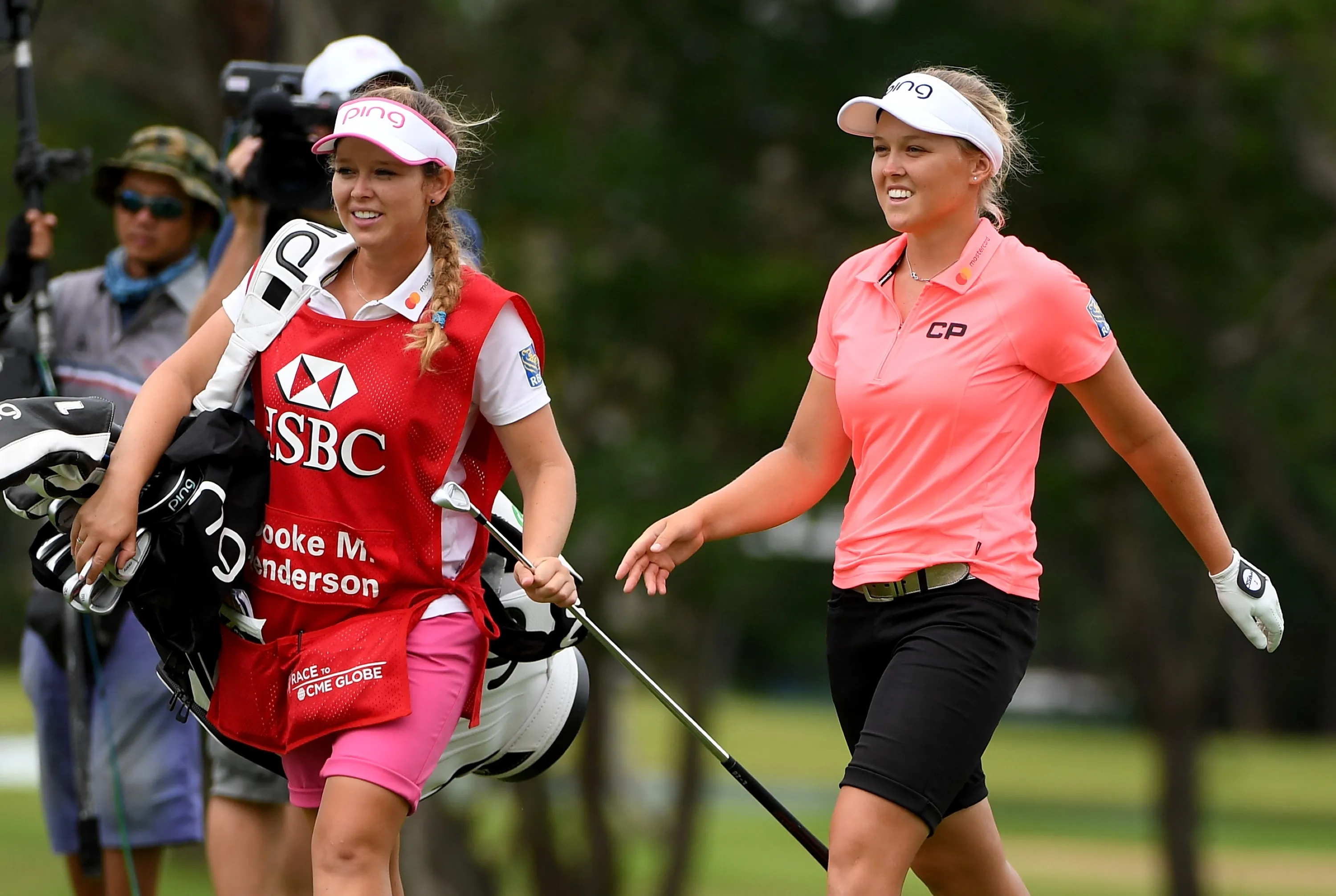 Brooke Henderson of Canada and her caddie Brittany Henderson on the 18th hole during the first round of the HSBC Women's Champions on the Tanjong course at Sentosa Golf Club on March 2, 2017 in Singapore. (Photo by Ross Kinnaird/Getty Images)