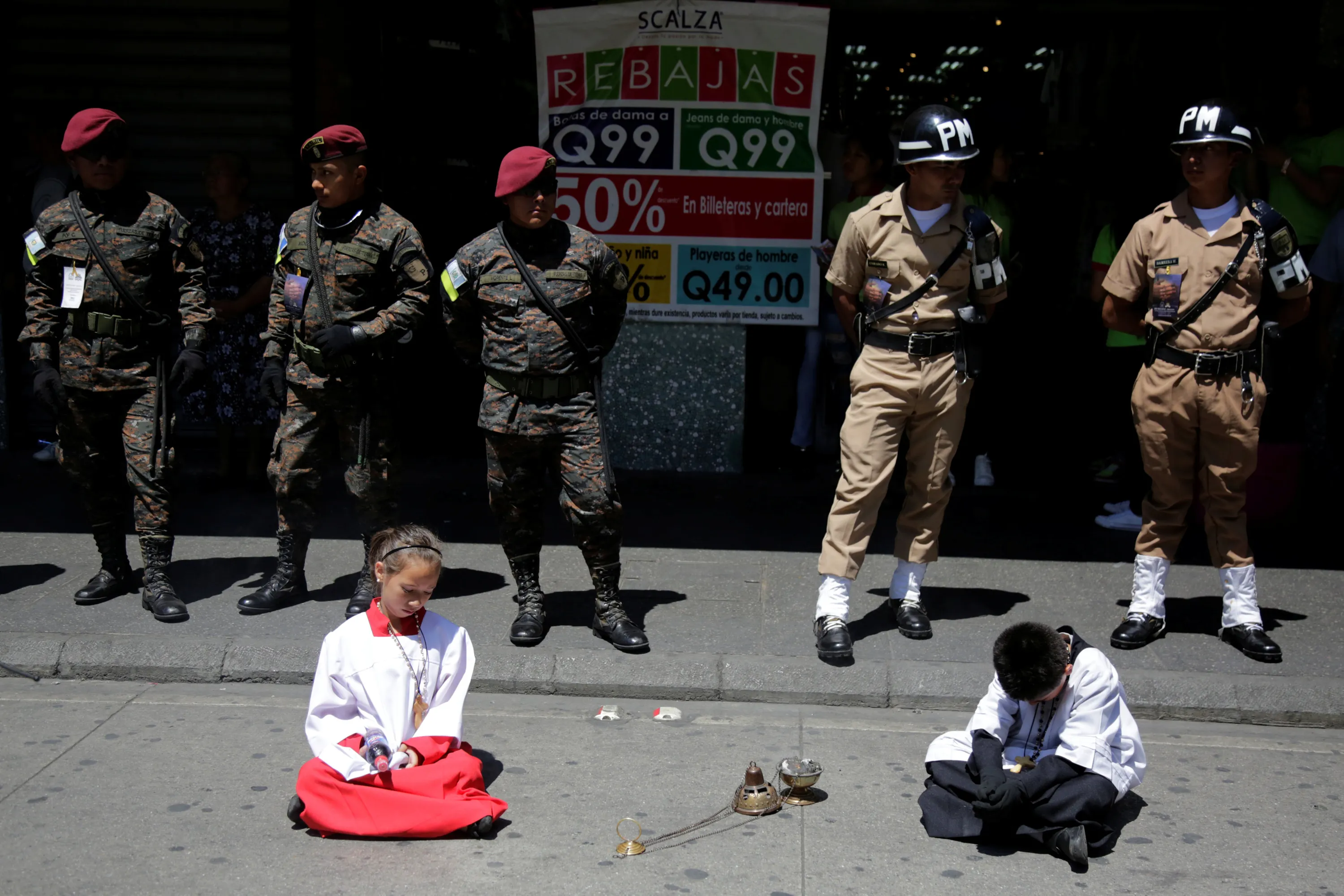 Children rest on the floor next to soldiers as they take part in a procession of Jesus Nazarene during the fourth Sunday of Lent in Guatemala City, Guatemala, March 26, 2017. (Photo by Luis Echeverria/Reuters)