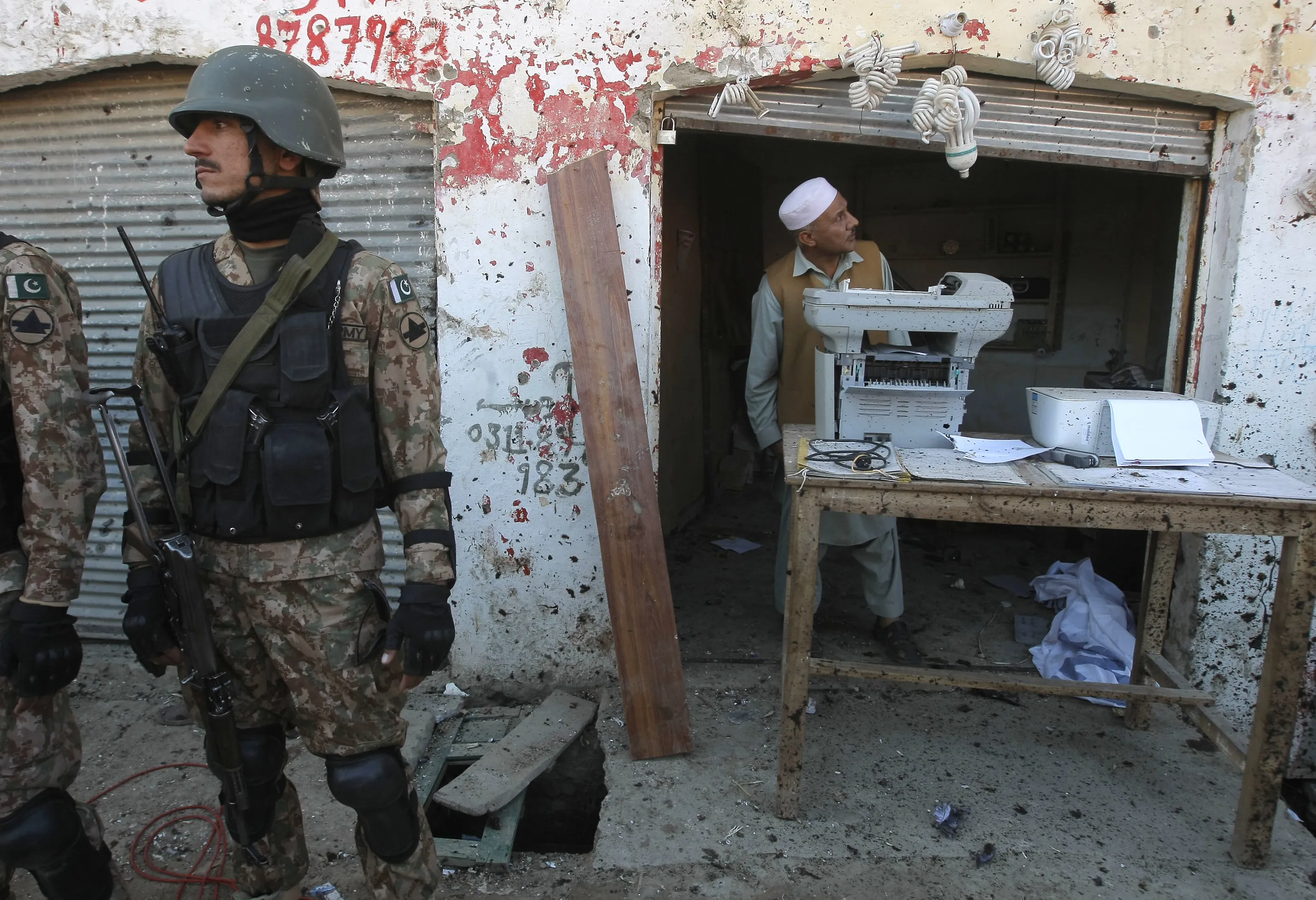 Pakistani soldiers stand alert outside a courthouse following suicide bombing in Charsadda, Pakistan, Tuesday, February 21, 2017. Police say three suicide bombers have attacked a courthouse in northwestern Pakistan. Charsadda police chief says one of the bombers detonated his suicide vest at the court's main gate while police shot and killed the two other assailants. (Photo by Mohammad Sajjad/AP Photo)