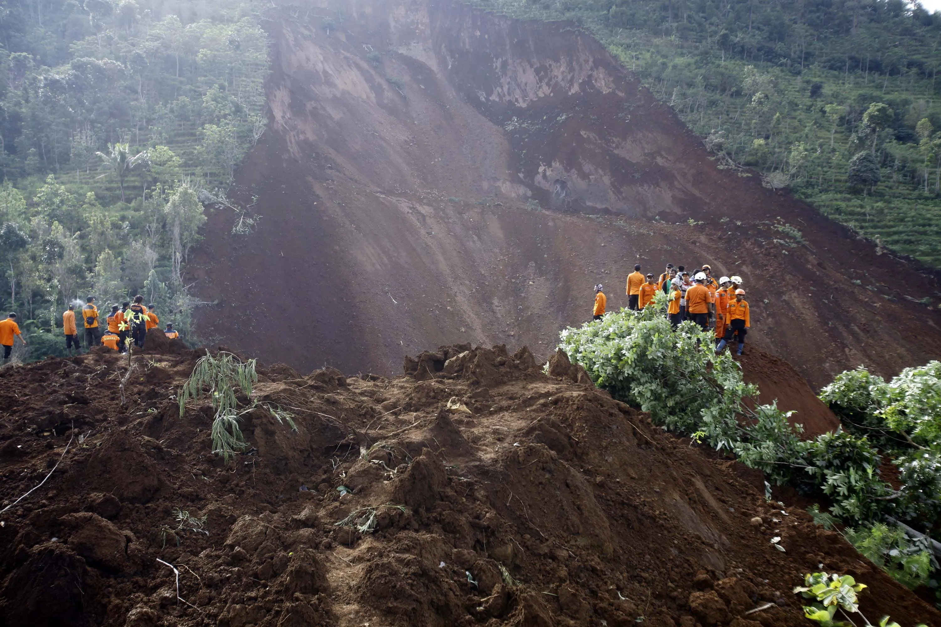 Indonesian rescuers search for victims at Banaran village which is hit by a landslide in Ponorogo, Indonesia, 02 April 2017. At least 28 people are missing and hundreds were evacuated to safer residential areas after a rain-triggered landslide hit a village in Ponorogo, East Java. (Photo by Ali Lutfi/EPA)