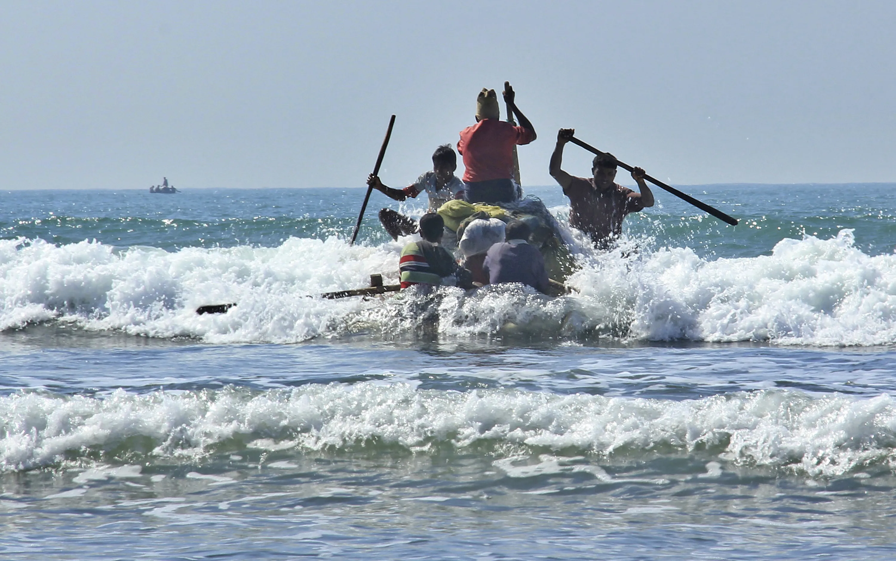In this January 16, 2017, photo, Rohingya fishermen launch a raft made of empty plastic containers to go fishing into the rough sea off of Tha Pyay Taw village, Maungdaw, western Rakhine state, Myanmar. (Photo by Esther Htusan/AP Photo)