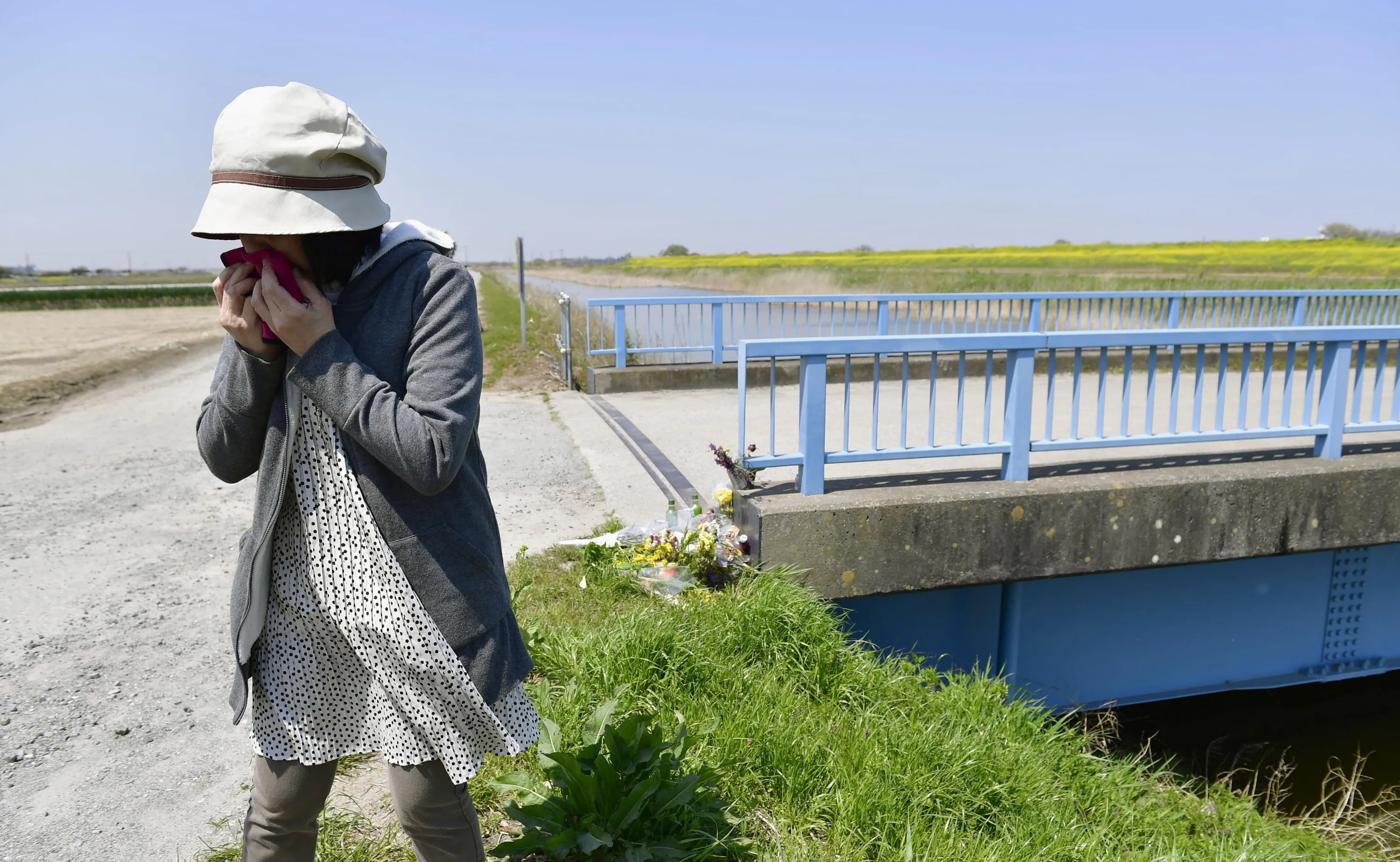 A woman sobs after offering flowers where a 9-year-old Vietnamese girl was found dead in Abiko, near Tokyo, Friday, April 14, 2017. Police have arrested a Japanese man in connection with the girl's death, weeks after her naked body was found near a trench. Chiba prefectural police said Friday they arrested 46-year-old real estate salesman Yasumasa Shibuya on suspicion he abandoned the girl's body. Japanese media say Shibuya headed a parents' association at the school the girl attended. (Photo by Ren Onuma/Kyodo News via AP Photo)