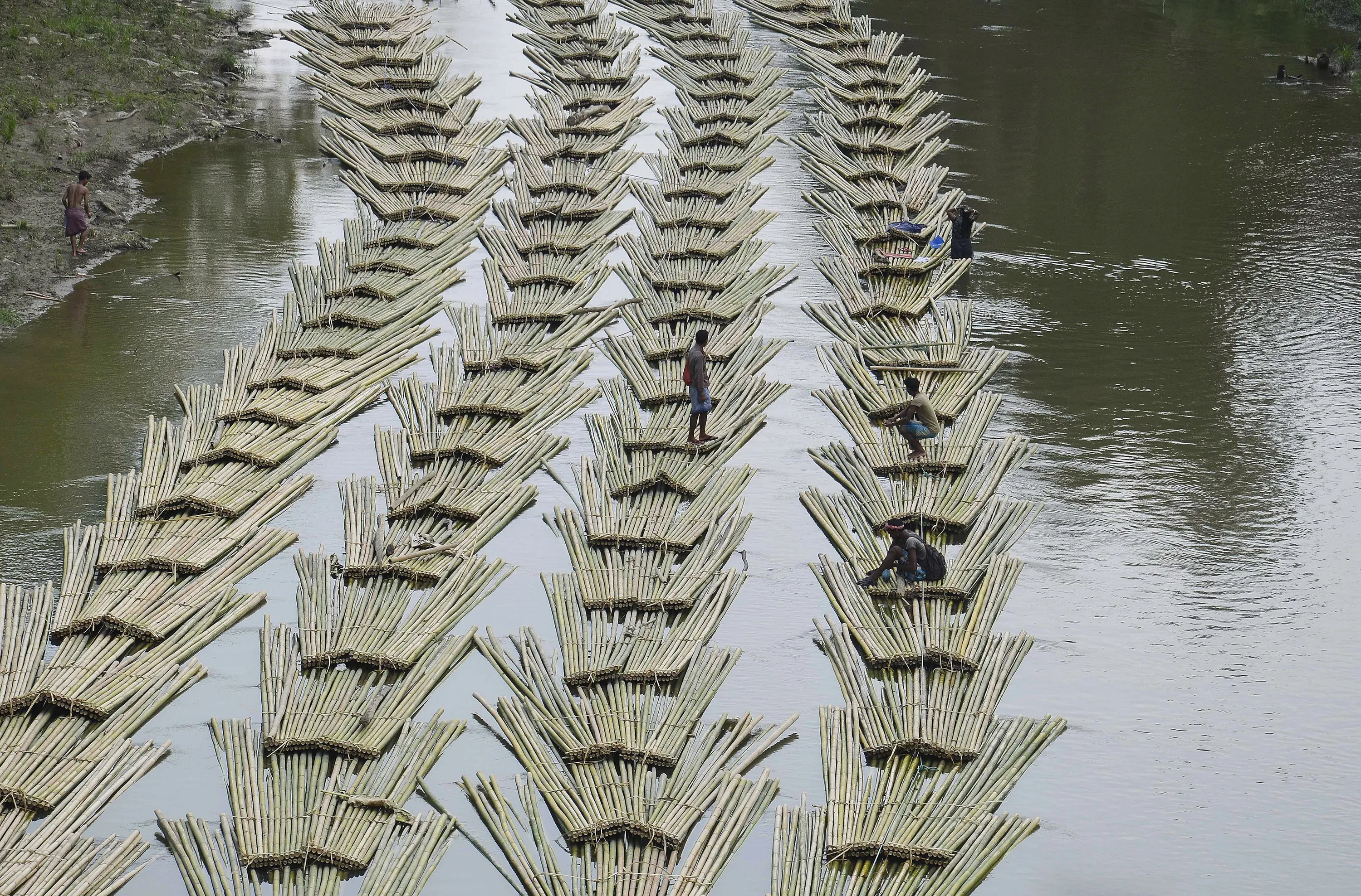 This photo taken on April 18, 2017 shows Indian labourers transporting bamboo logs down the Longai River near the Tripura-Mizoram state border in Damchara, India. (Photo by AFP Photo/Stringer)