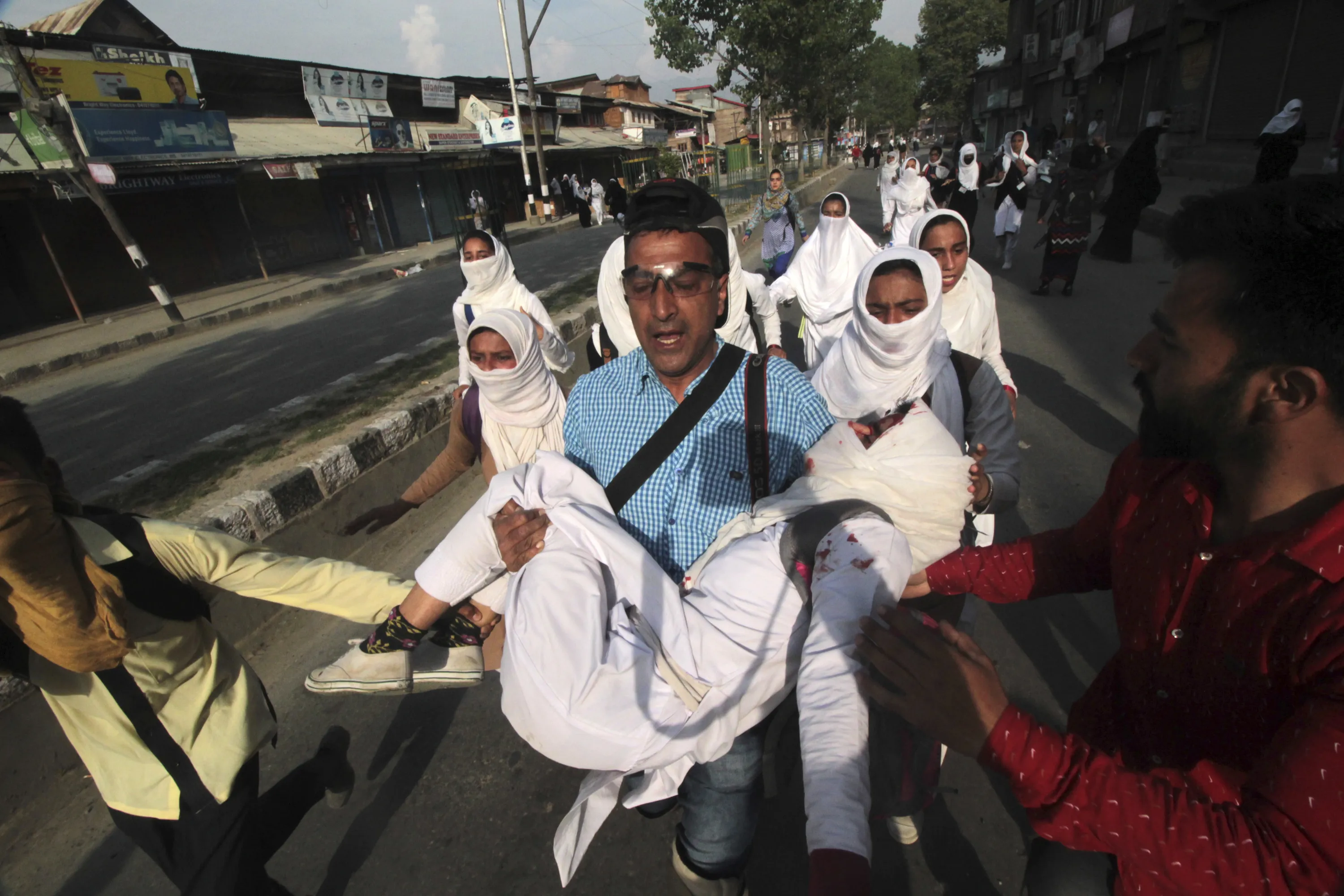 In this April 20, 2017 photo, Associated Press photographer Dar Yasin helps Khushboo Jan, 18, after she was injured during clashes between Kashmir students and India security forces in Pulwama, 30 kilometers (19 miles) south of Srinagar, Indian-controlled Kashmir. “It was an instant decision, and I didn't think twice”, Dar Yasin said. He explained that he was closest to the woman and so best able to help. “I gave my camera to a colleague. ... I took the injured girl in my arms”. (Photo by Faisal Khan via AP Photo)